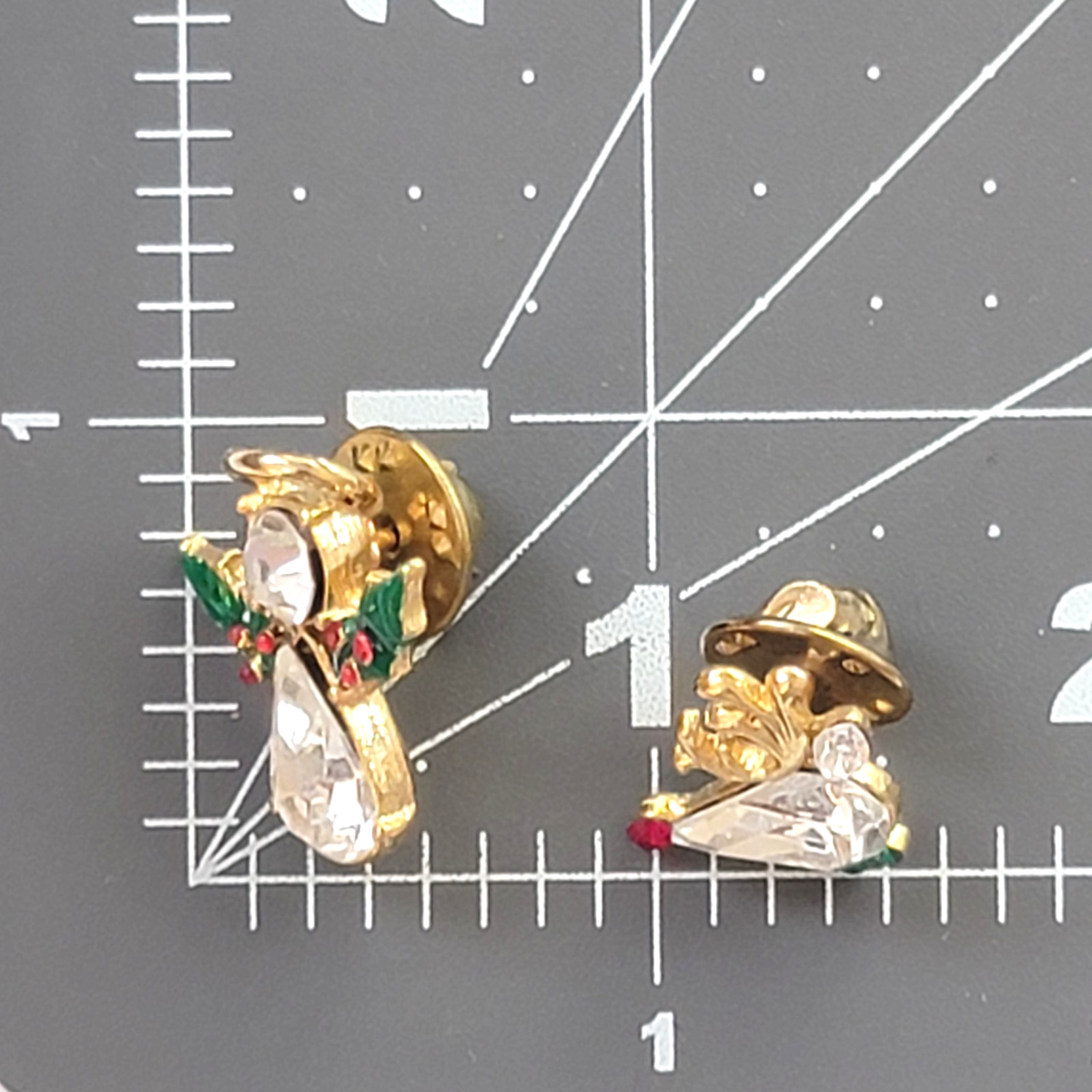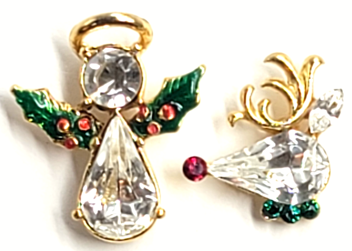 Christmas Angel Reindeer Rhinestone Pin Lot 2 Gold Tone Enamel Holiday Jewelry