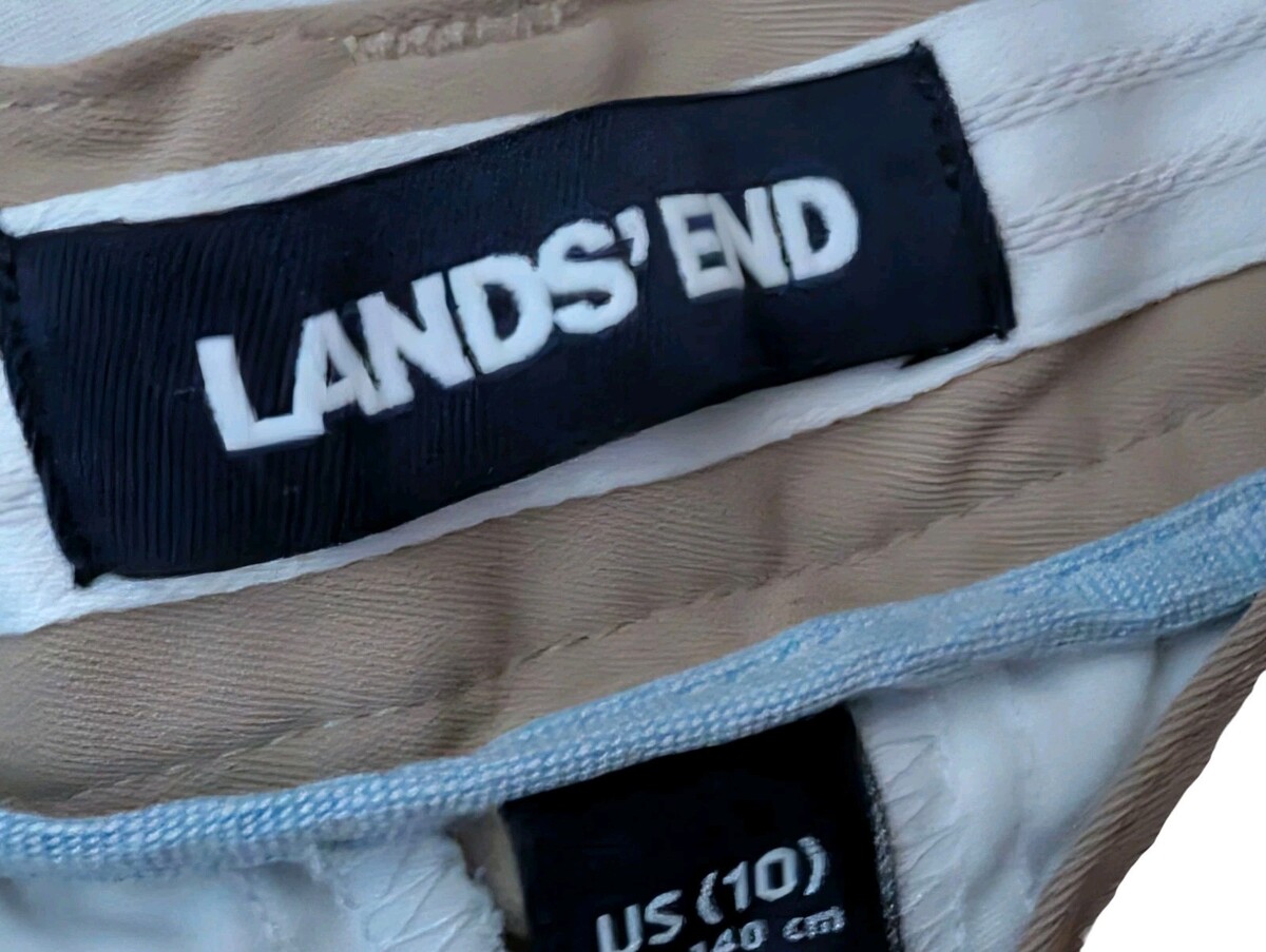 These are boys lands and khaki uniform style shorts. Size 10. They have the adjustable tabs on the waist. Left hip pocket also features a zippered pocket as well. Rear pockets. The shorts are in excellent condition!