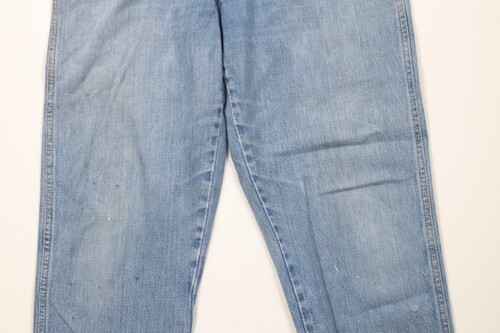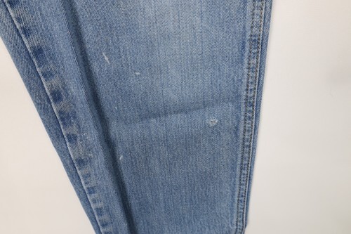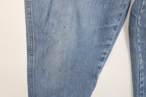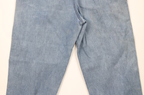 Hole bottom left leg and right leg. Has distressing on cuffs. Threadbare spots front waistband. Stains front and back. Distressed and faded