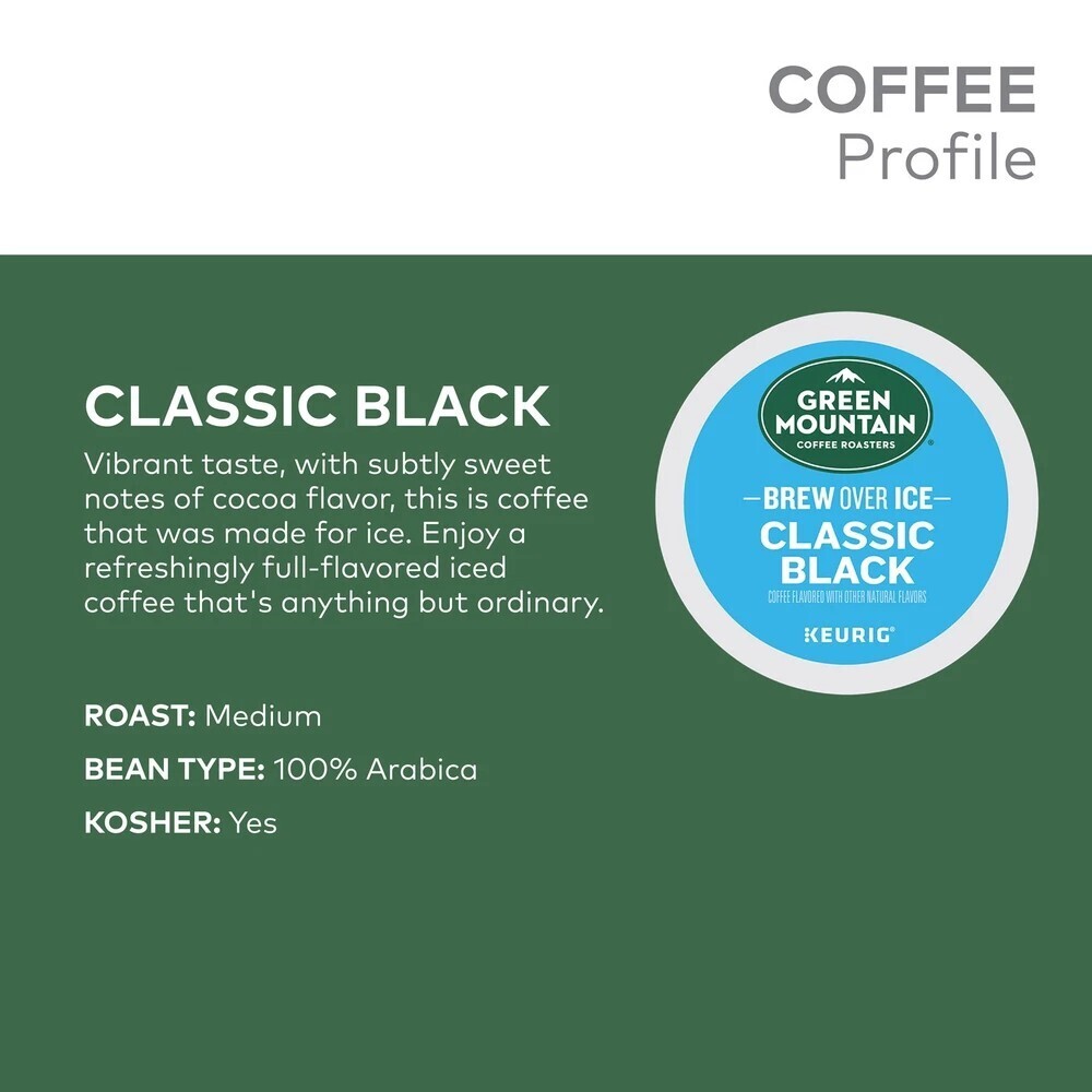 The mountains are a special place. It?s where Green Mountain Coffee Roasters was born. With a vibrant taste and subtly sweet notes of cocoa flavor, Green Mountain Coffee Roasters Brew Over Ice Classic Black K-Cup pods are specifically designed to hold up to ice. We start with a specially crafted premium medium roast blend, then add an extra boost of 100% Arabica coffee captured at its peak flavor.