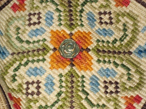 1960s 70's Style Earthy Boho Hippie Custom Made With Antique Vintage Reclaimed Colorful Thick Wool Embroidered Flower Piece In Blues, Green, Red, Orange and White With Vintage Green and Gold Acrylic Flower Button In Center.