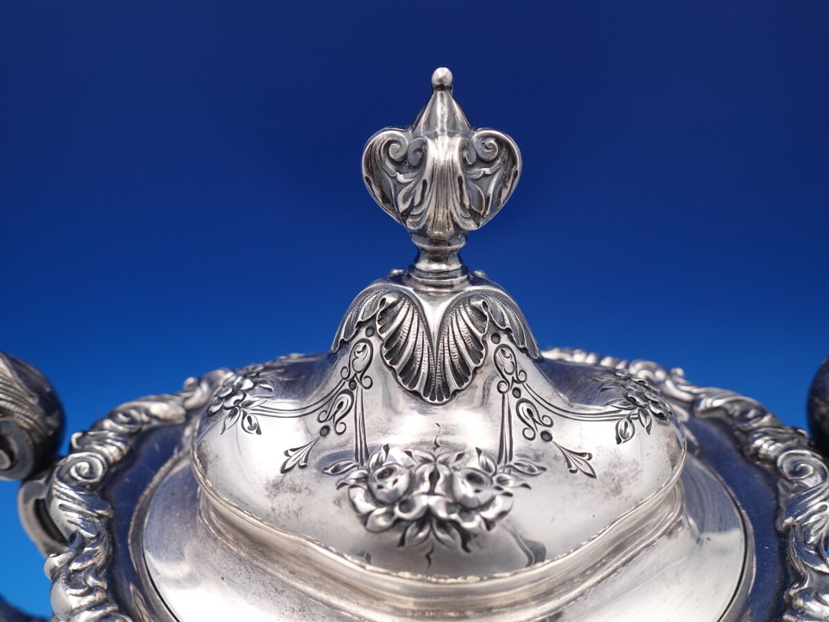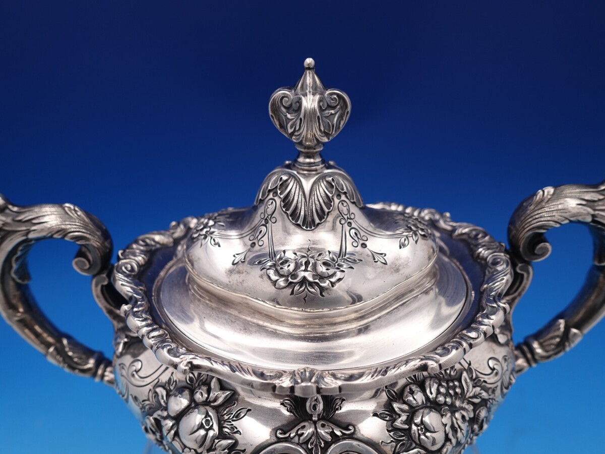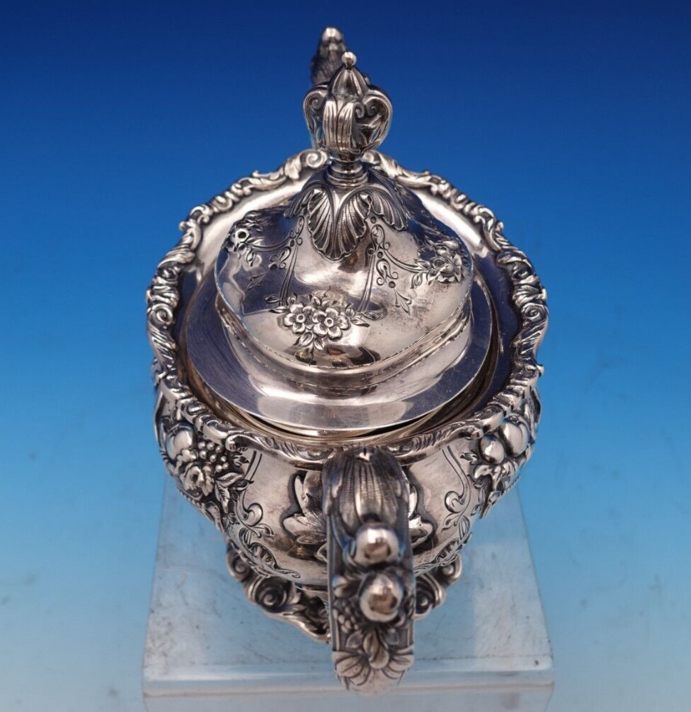 Gorgeous Francis I by Reed and Barton sterling silver sugar bowl with lid marked #570A. This piece measures 6 1/4" tall x 8 1/4" and weighs 28.5 troy ounces. It is not monogrammed and is in good estate condition as shown. Remarkable!