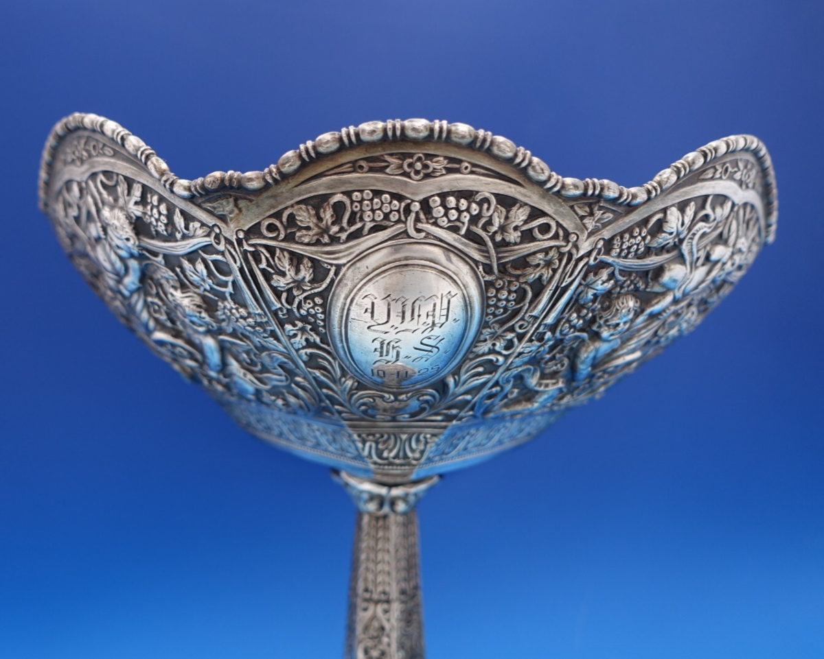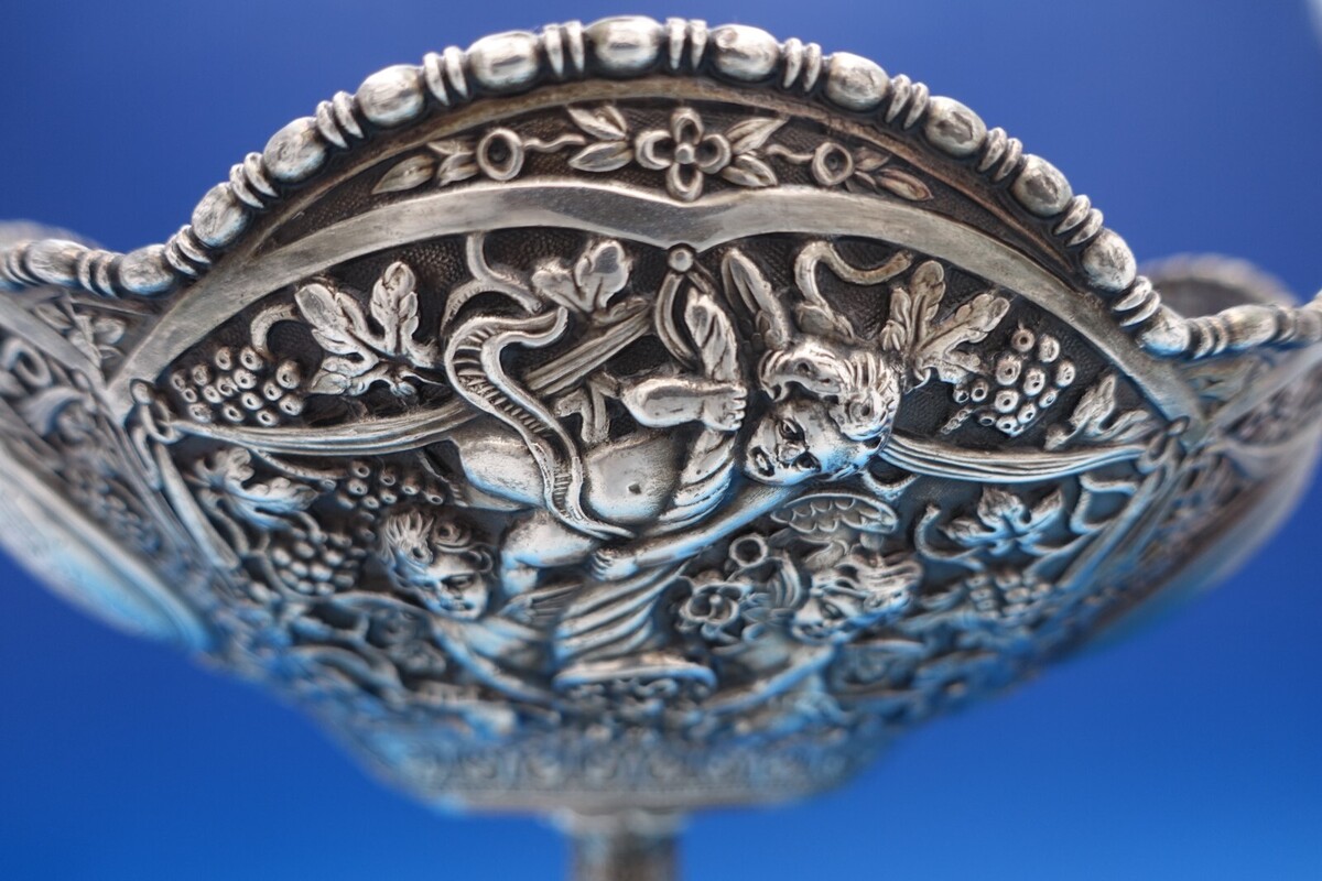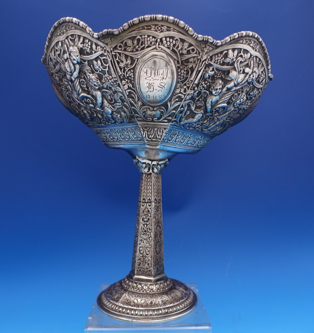 Lovely Derby Silver Co. silverplate raised centerpiece bowl marked #1264. This bowl features embossed winged cherubs with grapes, ribbons, and flowers. It measures 10 1/2" x 9 1/2". It is monogrammed with engraved date "10-11-25" (see photos), and is in good estate condition as shown.Exceptional!