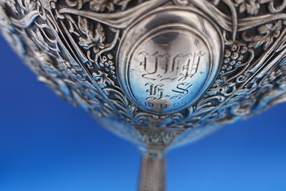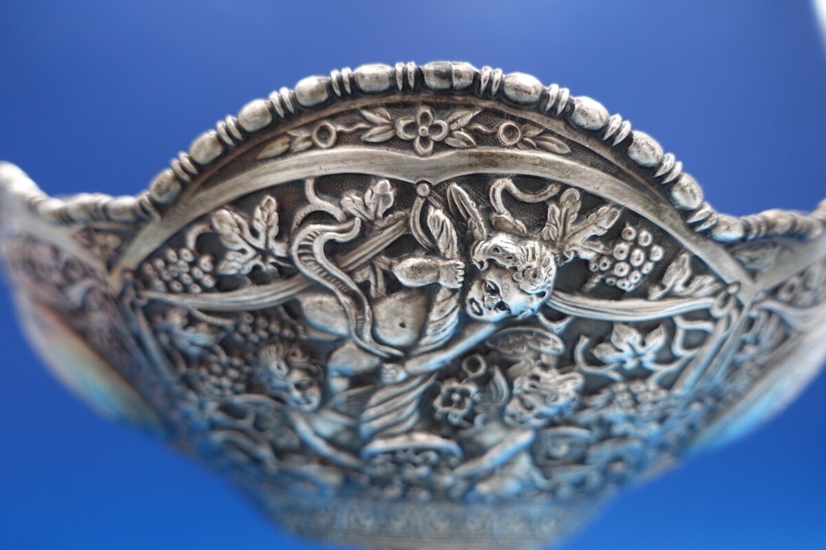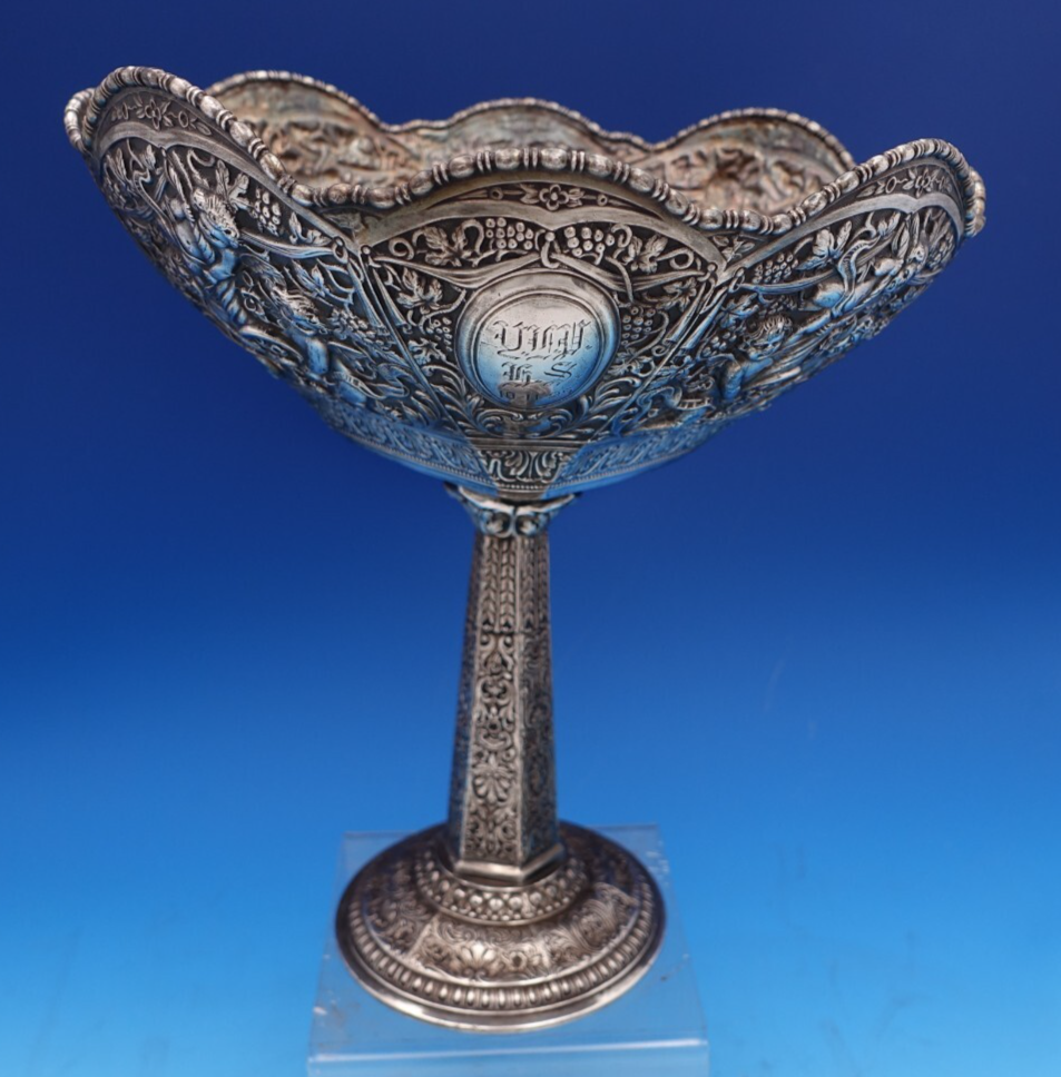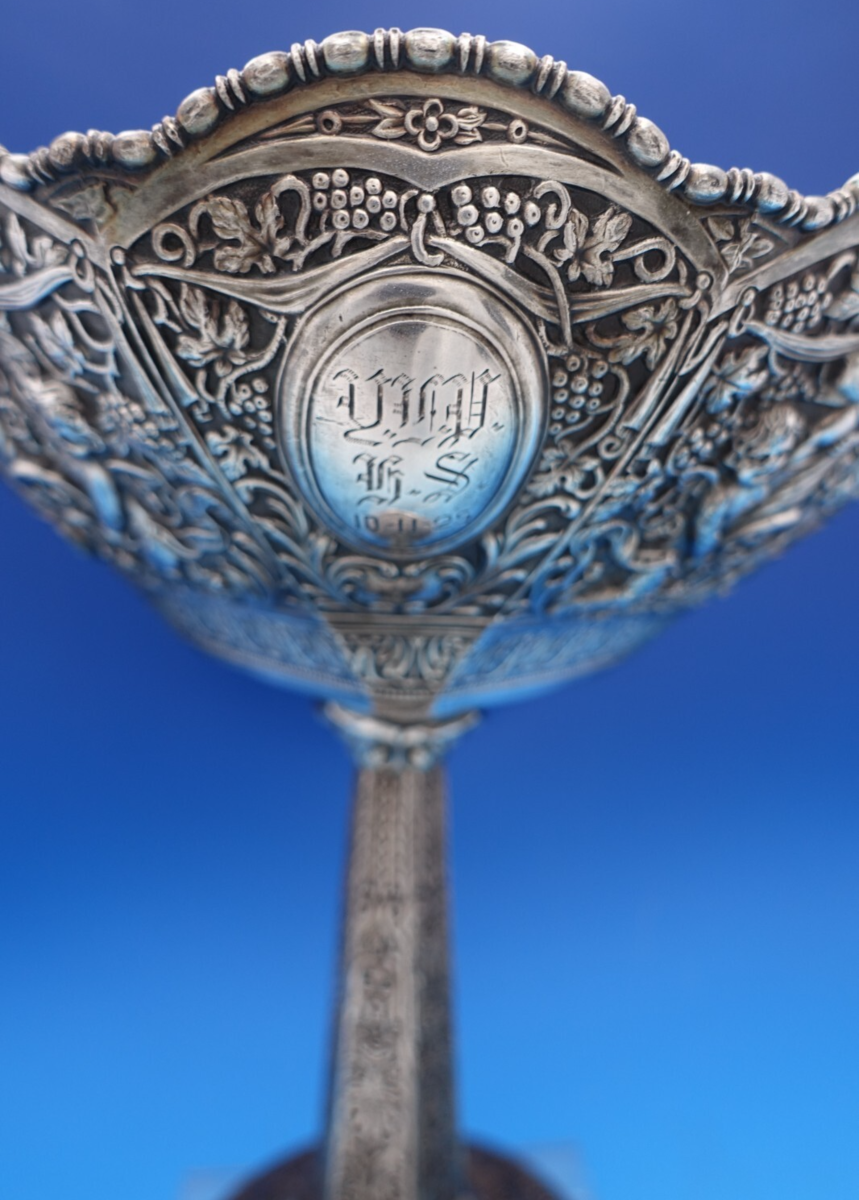 Lovely Derby Silver Co. silverplate raised centerpiece bowl marked #1264. This bowl features embossed winged cherubs with grapes, ribbons, and flowers. It measures 10 1/2" x 9 1/2". It is monogrammed with engraved date "10-11-25" (see photos), and is in good estate condition as shown.Exceptional!