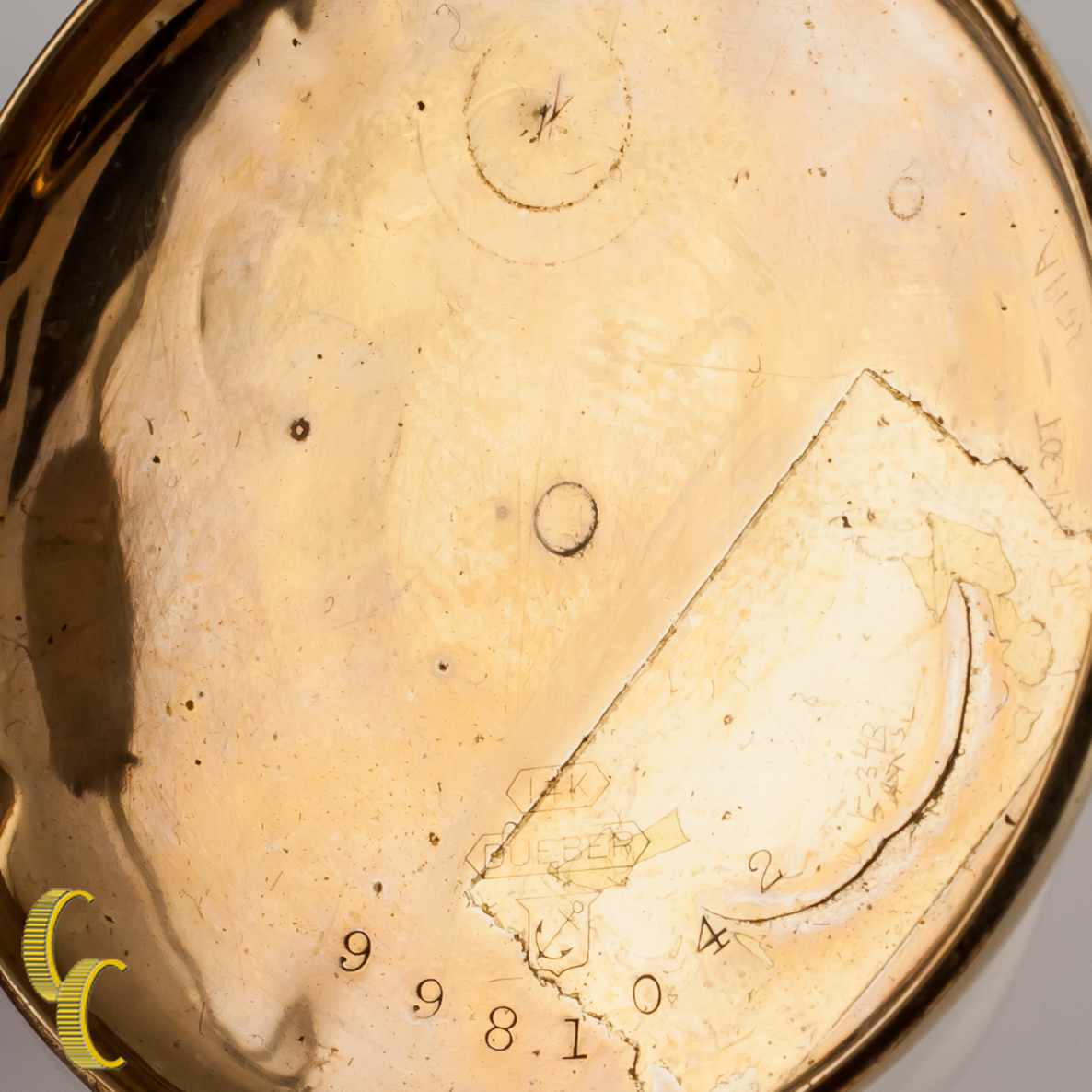 14k Gelbgold-Gehause mit kompliziertem handgeschütztem Design auf Gehause (Initialen Wak)