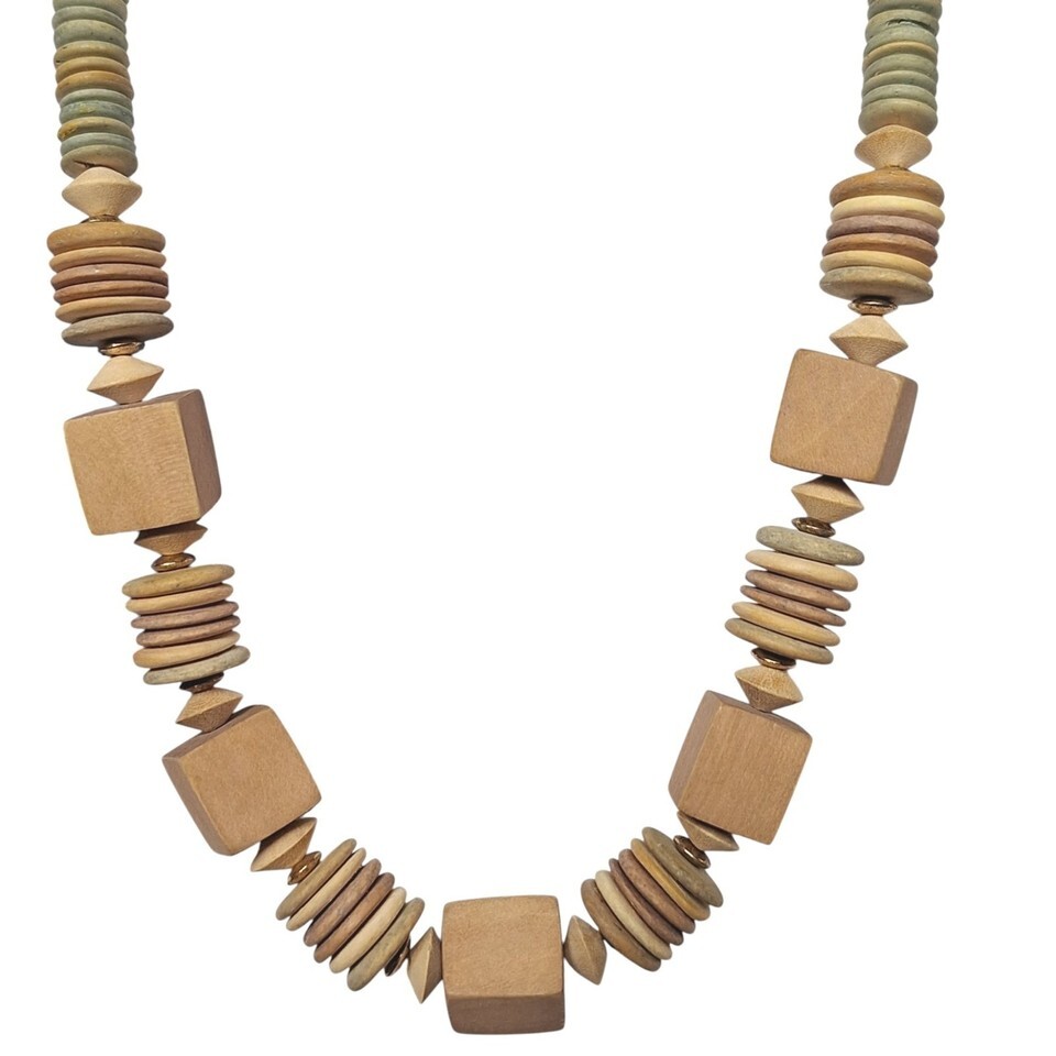 Vintage Artisan Wood Bead Necklace Cube Disc Hex Beads Bohemian Style Jewelry