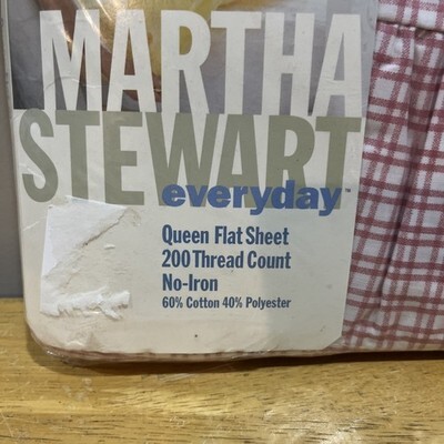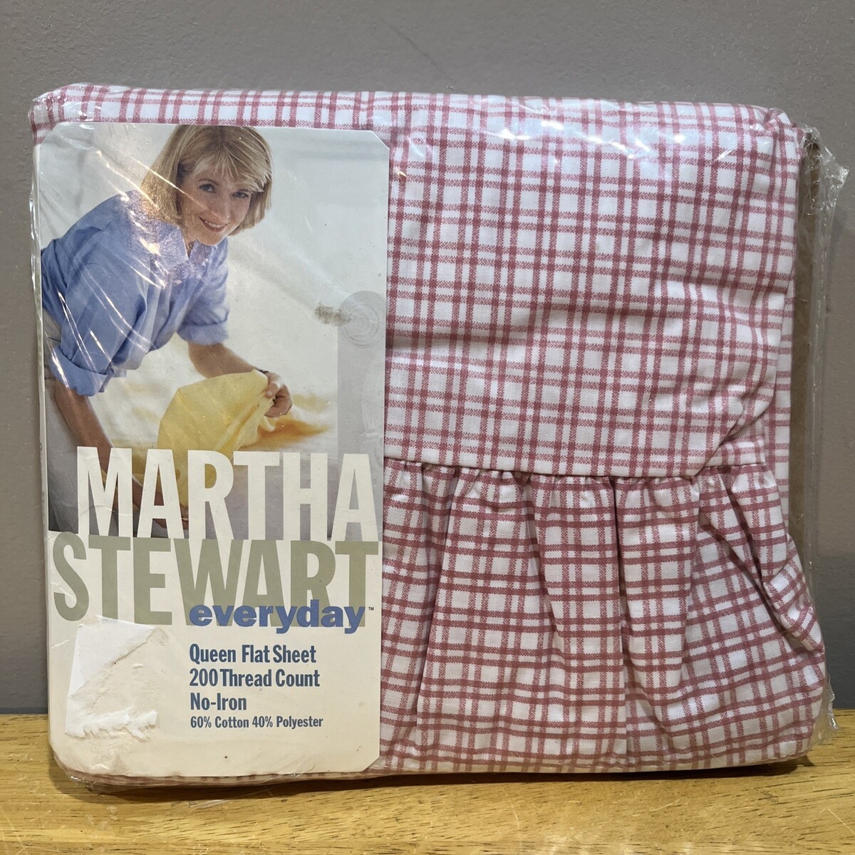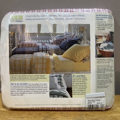 This product is a vintage Martha Stewart Everyday Rose Denim Check Queen Ruffled Flat Sheet. Made from a comfortable cotton blend material, this flat sheet features a charming checked pattern in a soft pink color, perfect for adding a touch of cottage style to any bedroom. The ruffled design adds a playful and feminine touch to the overall look, making it a unique and collectible piece for any bed and bath linens collection.