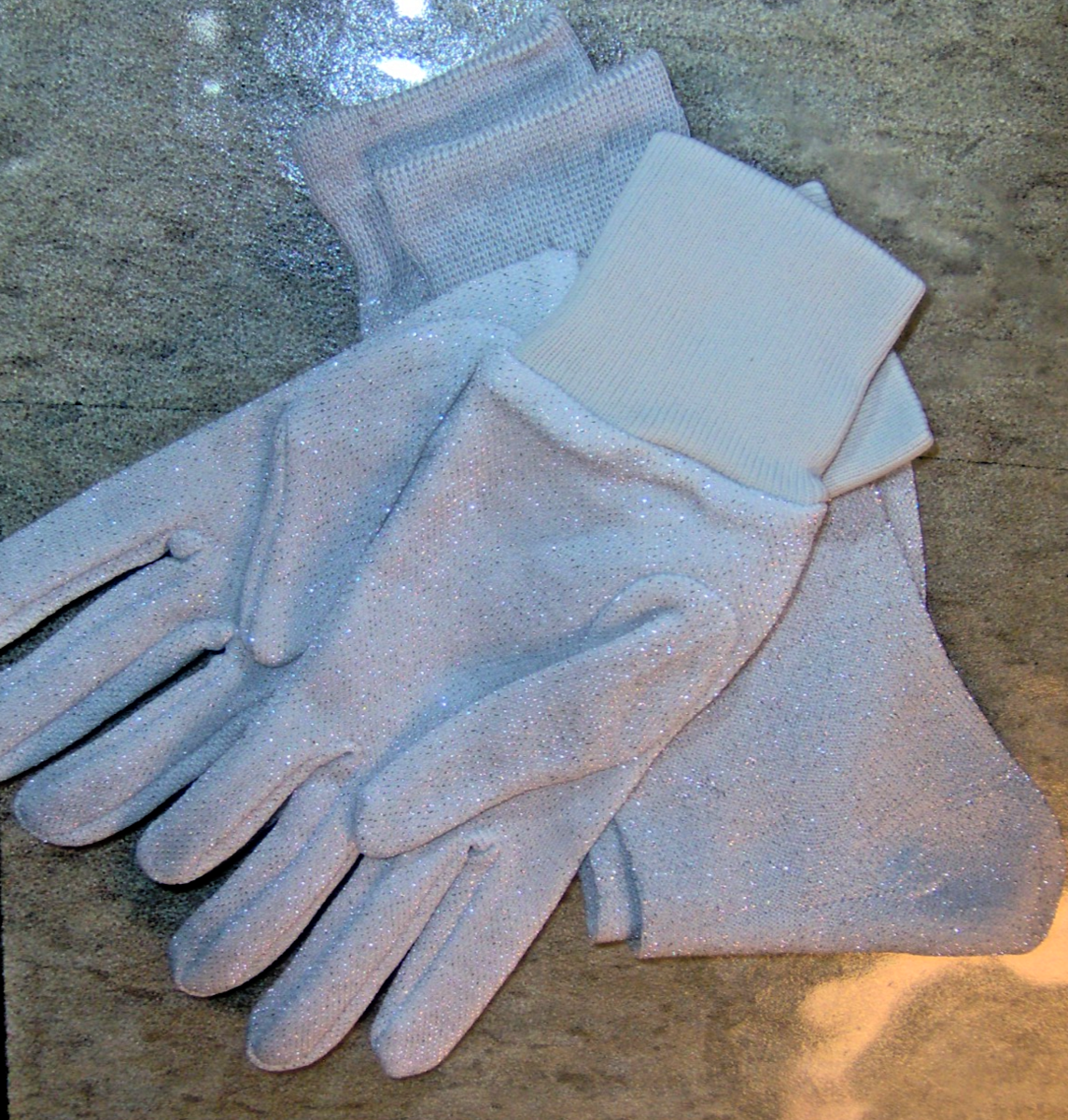 (1) NEW PAIR OF WHITE SPARKLE GLOVES AND ONE (1) NEW PAIR OF MATCHING WHITE SPARKLE SOCKS MANUFACTURED BY UNKNOWN. THESE ARE A MATCHING SET IN SMALL STRETCHY SIZE, GREAT FOR A MAGICIAN, SHOWGIRL OR STAGE PERFORMER, WHERE THE GLITTER OR SPARKLE ADDS TO THE VISUAL EFFECT. SILVER SPARKLE THREAD GRABS THE EYE. YOU WILL RECEIVE ONE (1) NEW PAIR OF WHITE GLITTER GLOVES AND ONE PAIR OF MATCHING WHITE GLITTER SOCKS, AS PICTURED, SHIPPED BY USPS....