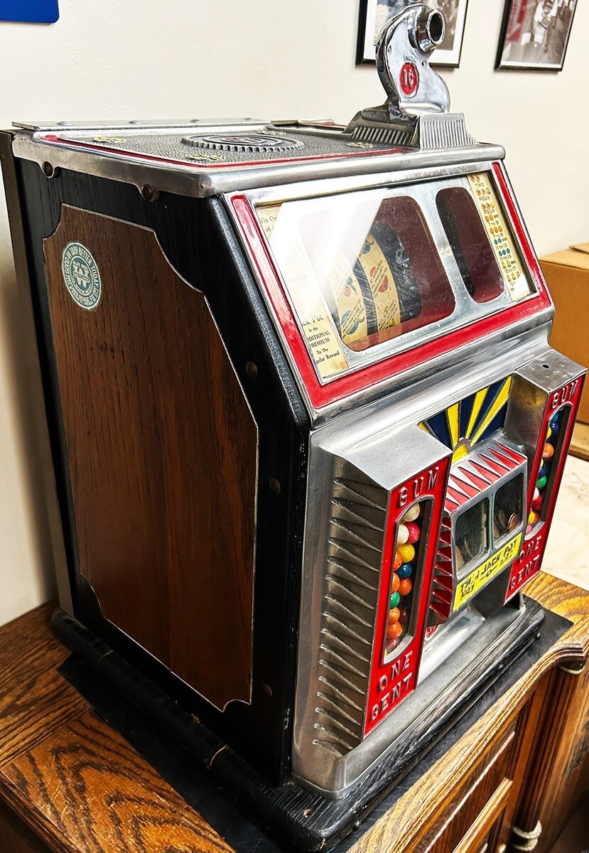 The Watling 1c Blue Seal Slot Twin Jackpot, Front Gumball Vender circa 1920 is a vintage slot machine made by Watling in the United States. This collectible piece would have been used in a casino setting during the early 20th century. The blue seal adds a unique touch to this classic slot machine, making it a sought-after item for collectors of vintage gaming memorabilia.