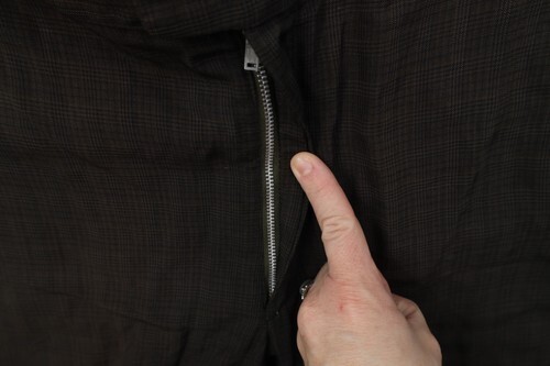 Hole upper left leg. Blemishes front and back. Discolored and faded. Blemishes and wear inside. USA made. Has an extra 2.5 inches of inseam fabric