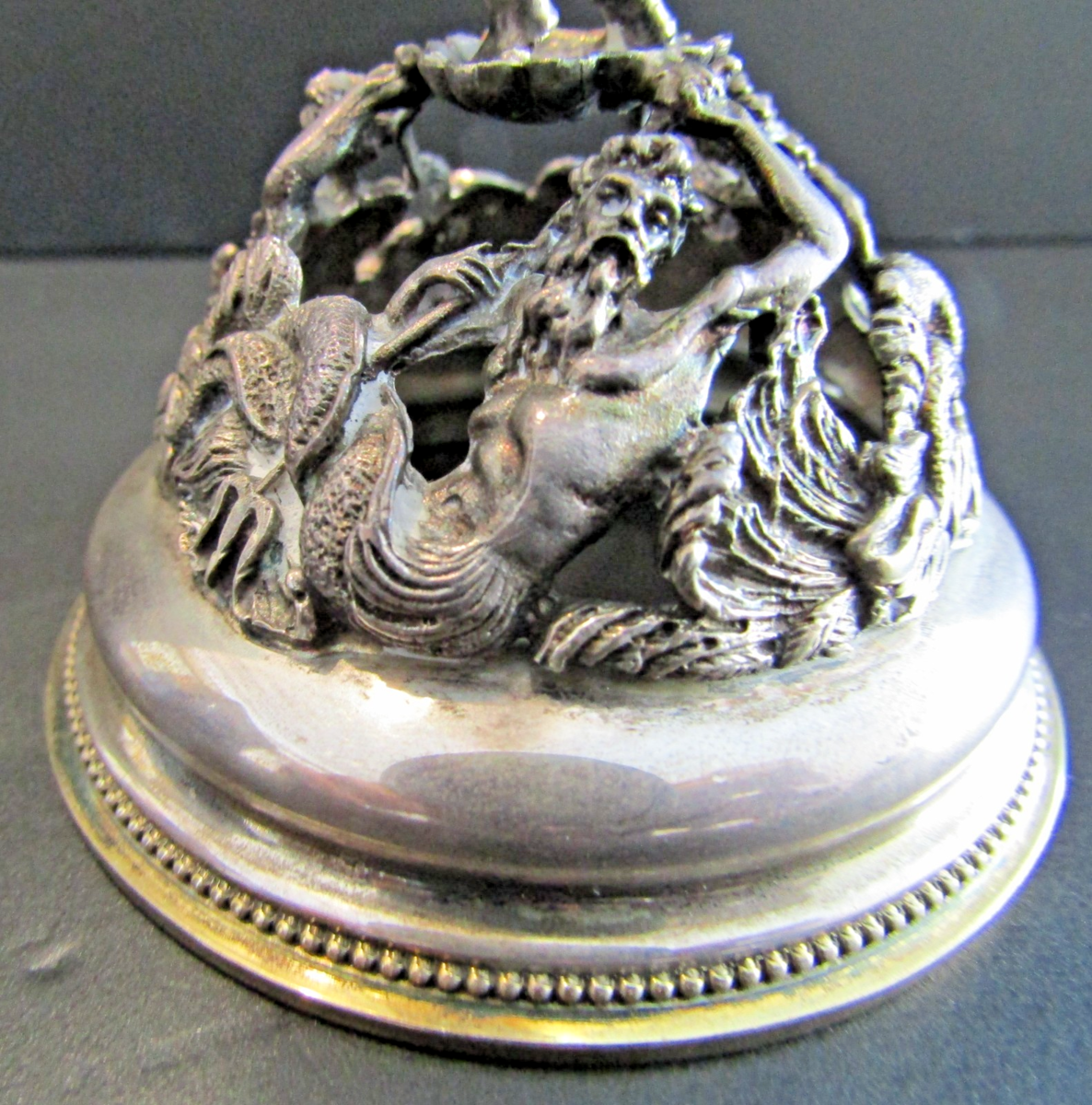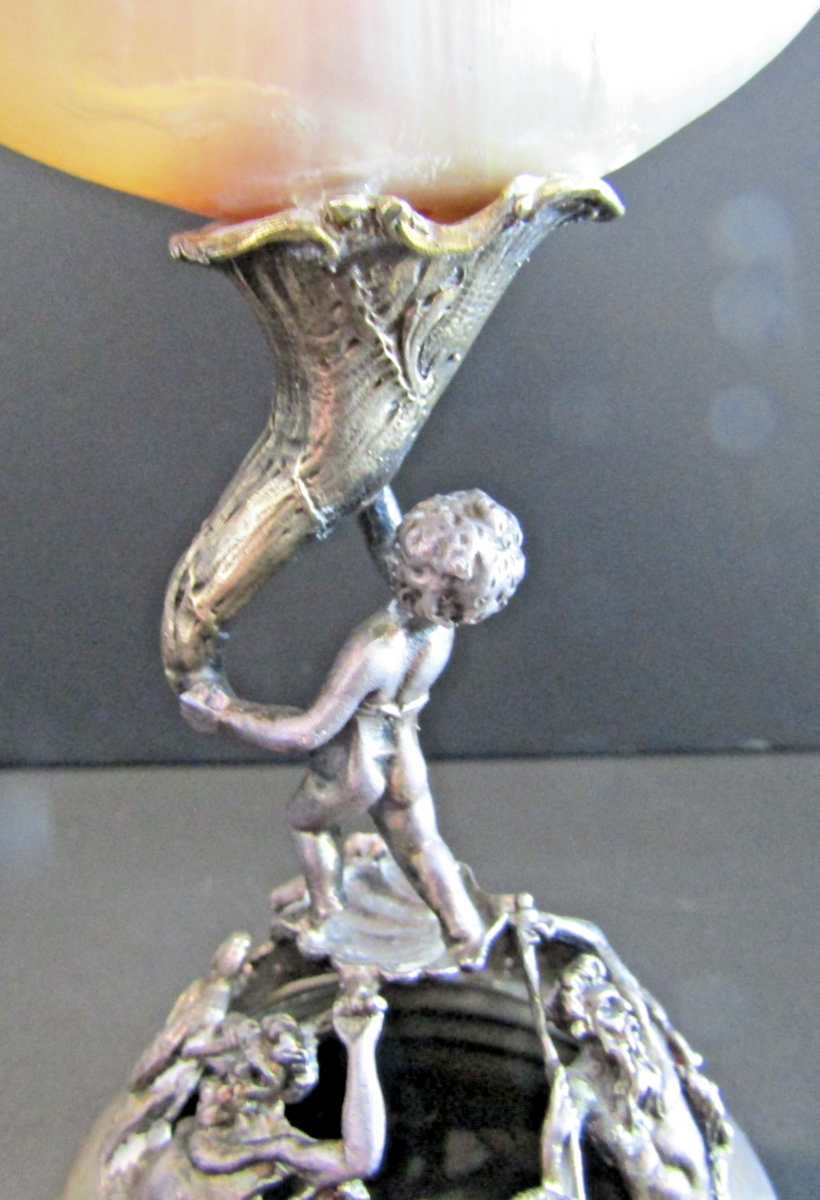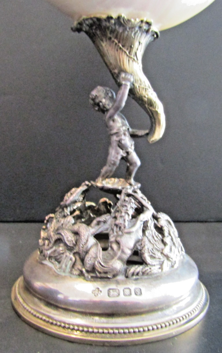 Nautilus shell cup with ornate sterling silver mounts, a decorative item inspired by historical "cabinets of curiosities" pieces. The mount features figures, including a central standing figure of a putto, or a mythological figure like Neptune, above a base depicting sea creatures and waves.