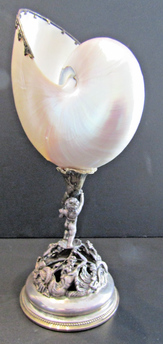 Materials: The main body is a polished natural nautilus shell, a pearled Nautilus pompilius. The base and rim mounts are made of sterling silver, depicting mythological or marine motifs.