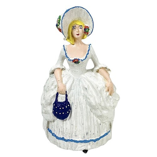 Unmarked; commonly attributed to Littco Products or Albany Foundry based on form and construction. Features a detailed white dress, bonnet, and blue handbag.