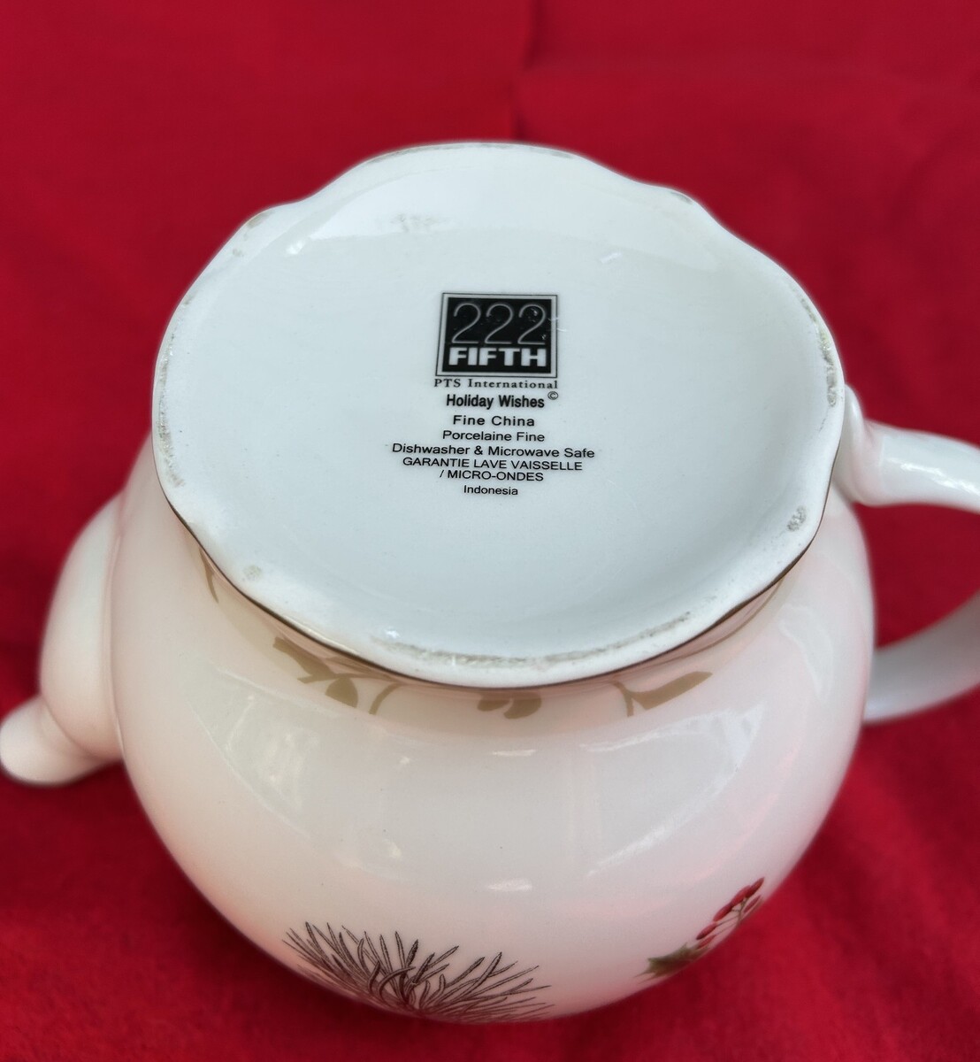 Holiday Wishes teapot by 222 Fifth, fine china with poinsettia & pinecones 6cup