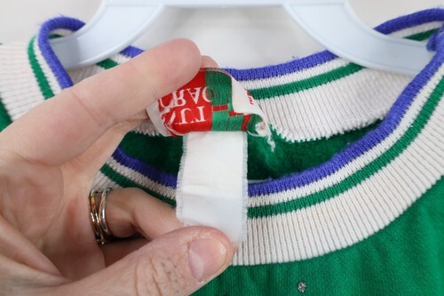 Graphics faded, discolored. Collar discolored. Color faded. Pilling. USA made