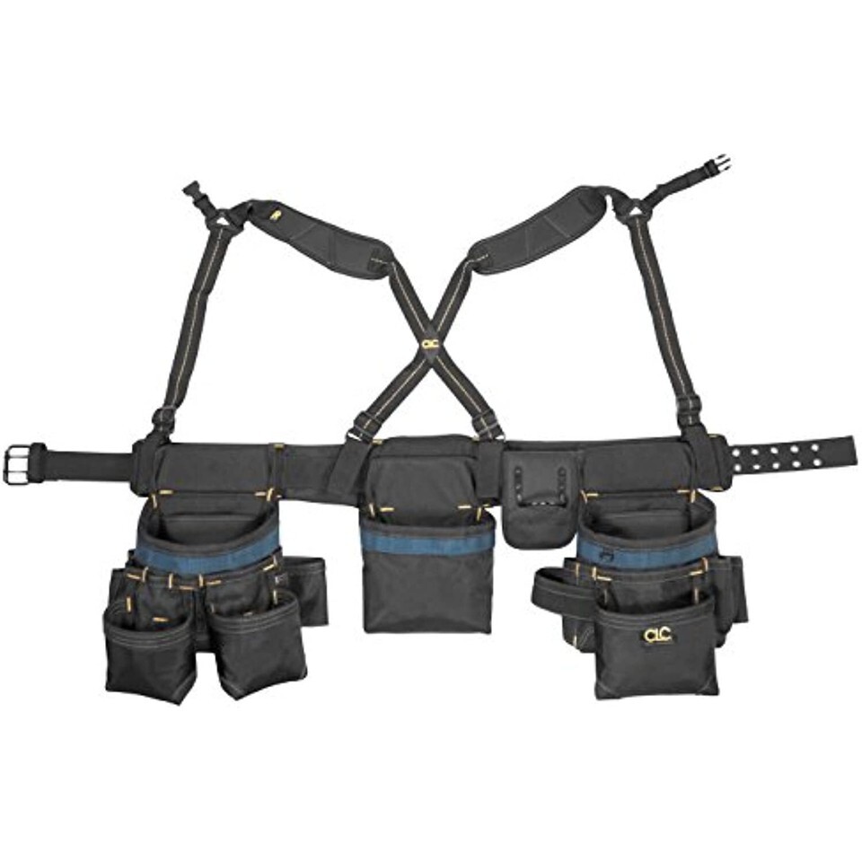 The CLC 2617 framing Master tool belt is the perfect tool belt for any Craftsman or professional builder's needs. This tool belt has 28 convenient pockets for all varieties and sizes of tools you need within arms reach. Equipped with 6-piece carpenter's ballistic Combo as well for specialty tools. Has a double layer of rugged, lightweight ballistic poly fabric to survive all wear and tear. Adjustable and padded suspenders to hold and distribute weight comfortably so you can keep on working all day long. The main pockets are reinforced on the bottom with PVC material for better resistance from breakage as well. The belt is 5-inches wide and padded for comfort even with an attached steel roller bucket. Fits waist sizes 29-inches - 46-inches for any size Carpenter, Craftsman, or professional builder.
