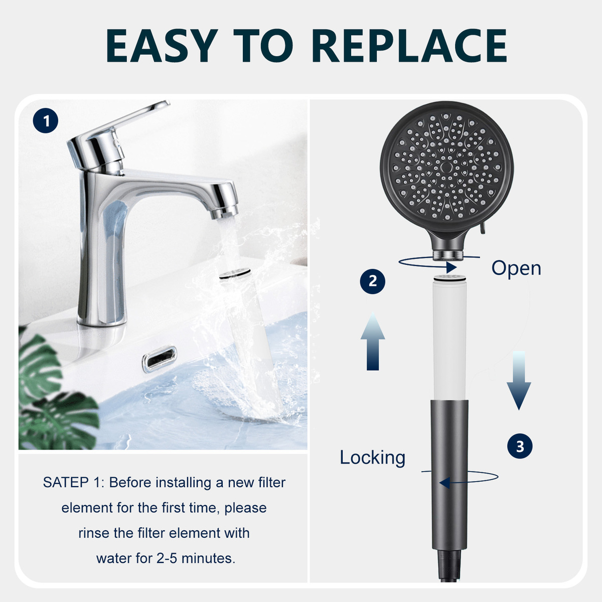 Replacing your filter takes less than 20 seconds no tools required, you just need to unscrew the shower head by hand, take out the old one and replace the new one,make sure the washer is in the slot which is inside the filter to avoid leaking.