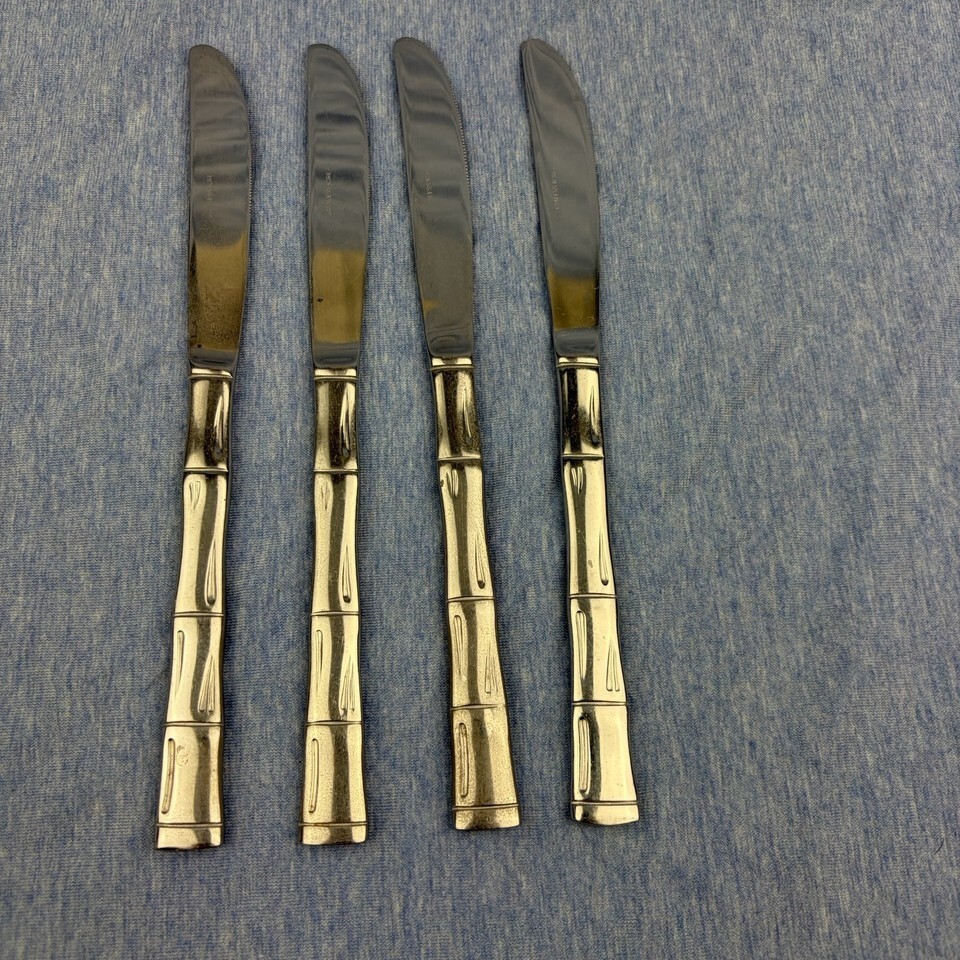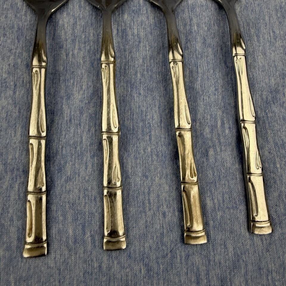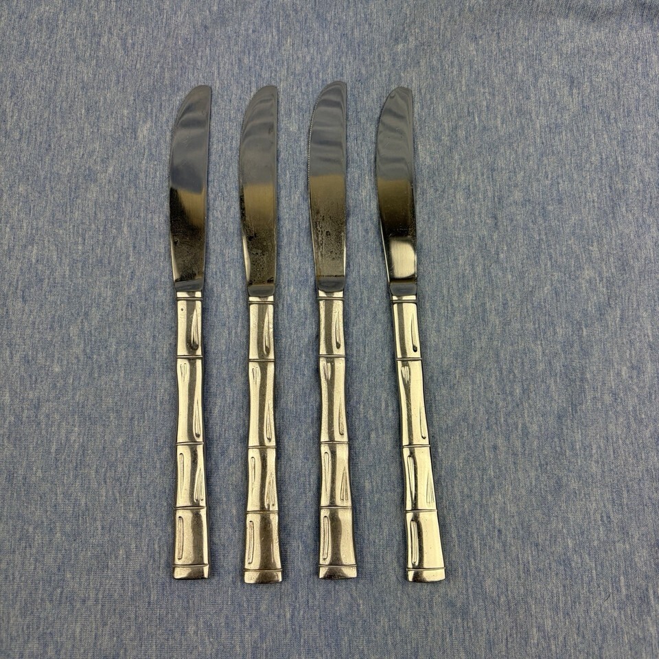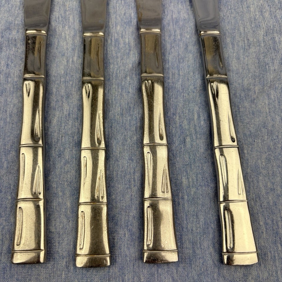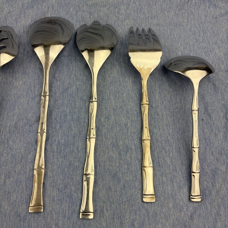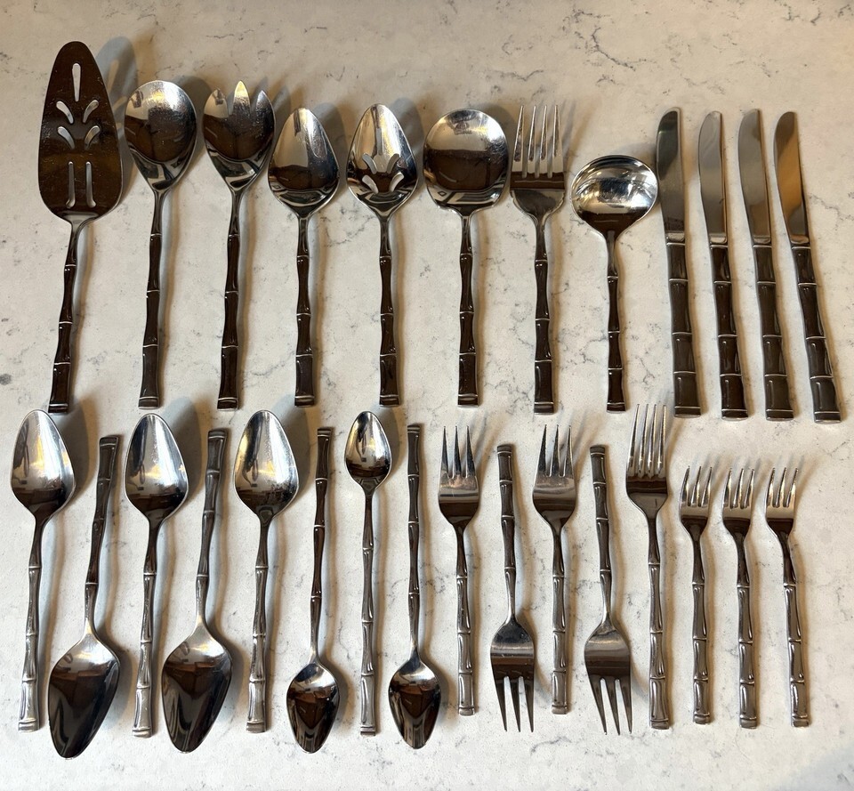 Lot of 28 pieces of discontinued EXF8 by Excel stainless flatware with bamboo pattern handles. The lot includes: one Pierced Pie Server, one Solid Salad Serving Spoon, one Solid Salad Serving Fork, one Solid Tablespoon Serving Spoon, one Pierced Tablespoon Serving Spoon, one Solid Smooth Casserole Spoon, one Medium Solid Cold Meat Serving Fork, one Solid Gravy Ladle, four Modern Solid Knives, five Place/Oval Soup Spoons, three Iced Tea Spoons, four Salad Forks, one (dinner) Fork, and three Cocktail/Seafood Forks. The lot is overall in good preowned condition ? there are spots of tarnish on many pieces, along with scratches from normal wear. Please see pictures for exact condition details. Made in Korea. Ships next day!