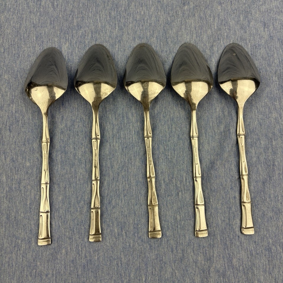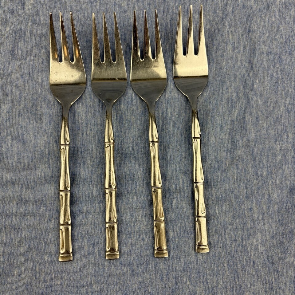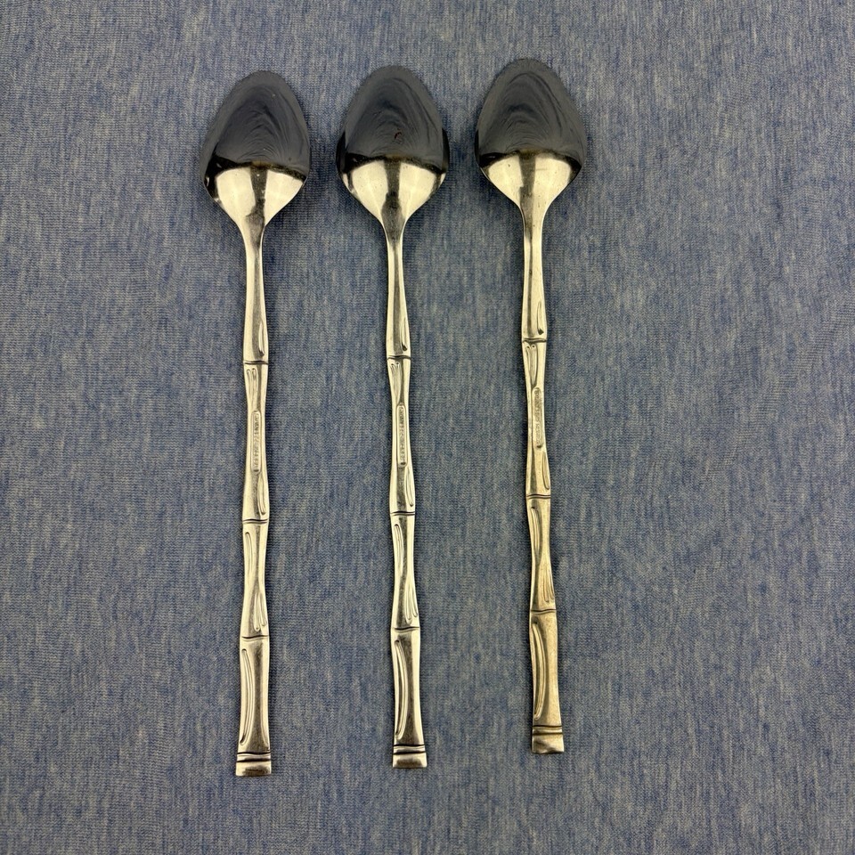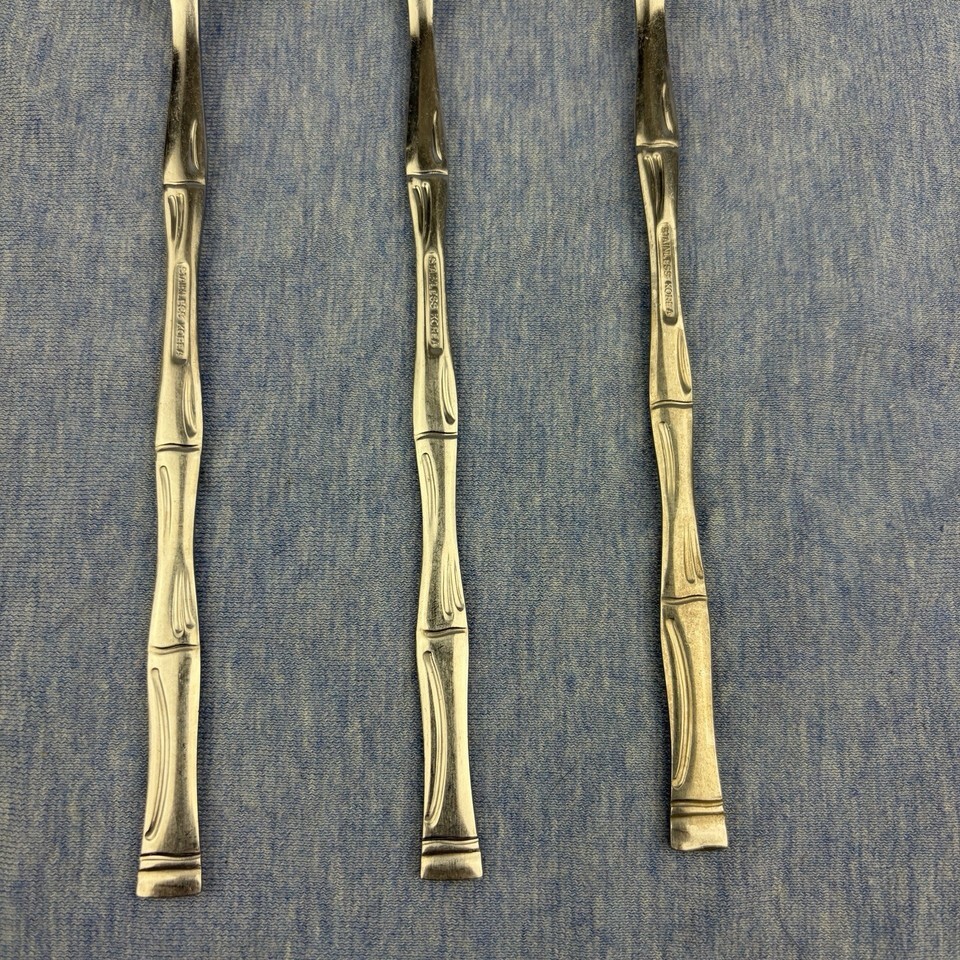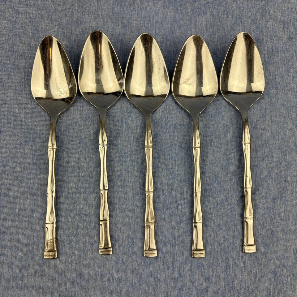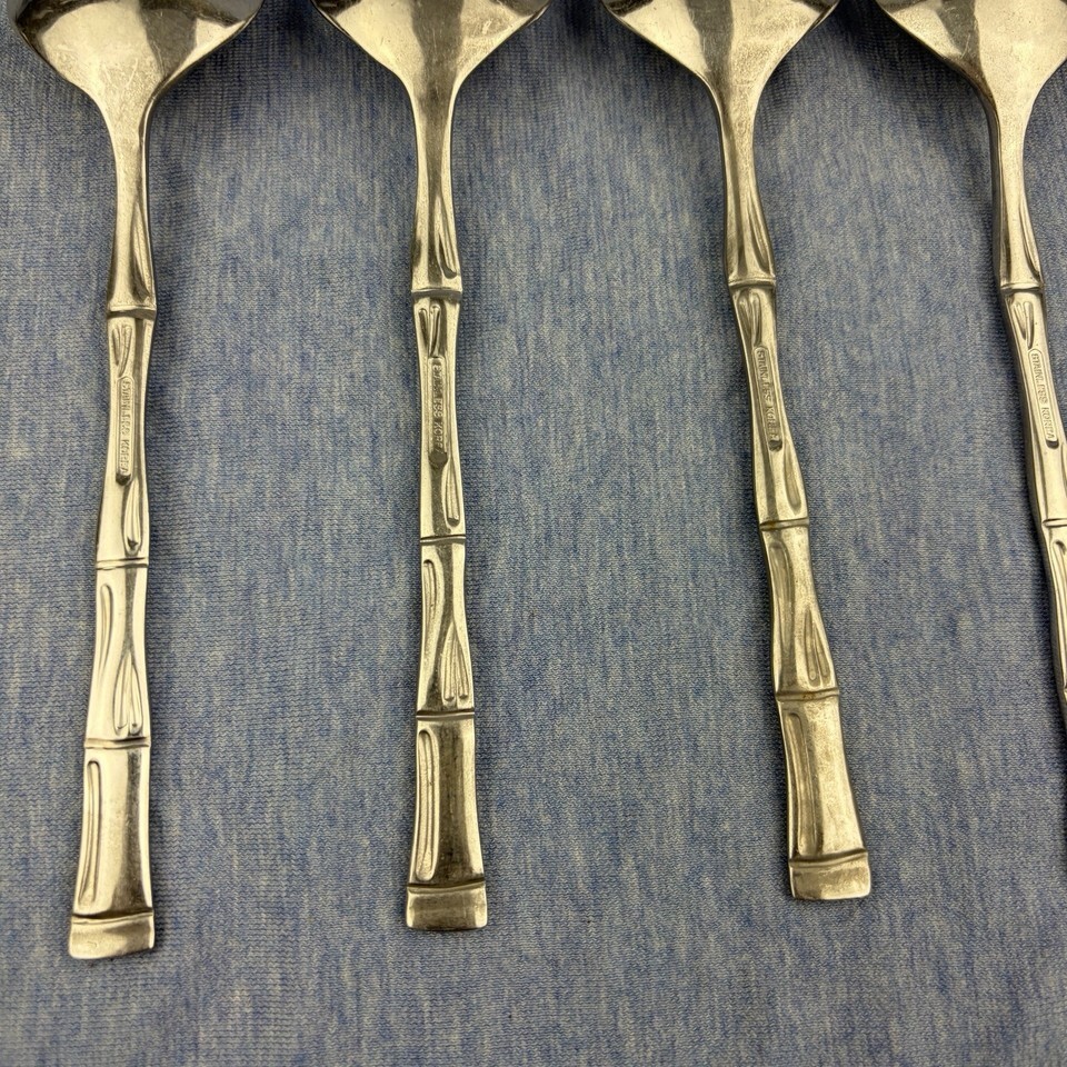 Lot of 28 pieces of discontinued EXF8 by Excel stainless flatware with bamboo pattern handles. The lot includes: one Pierced Pie Server, one Solid Salad Serving Spoon, one Solid Salad Serving Fork, one Solid Tablespoon Serving Spoon, one Pierced Tablespoon Serving Spoon, one Solid Smooth Casserole Spoon, one Medium Solid Cold Meat Serving Fork, one Solid Gravy Ladle, four Modern Solid Knives, five Place/Oval Soup Spoons, three Iced Tea Spoons, four Salad Forks, one (dinner) Fork, and three Cocktail/Seafood Forks. The lot is overall in good preowned condition ? there are spots of tarnish on many pieces, along with scratches from normal wear. Please see pictures for exact condition details. Made in Korea. Ships next day!