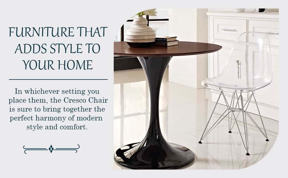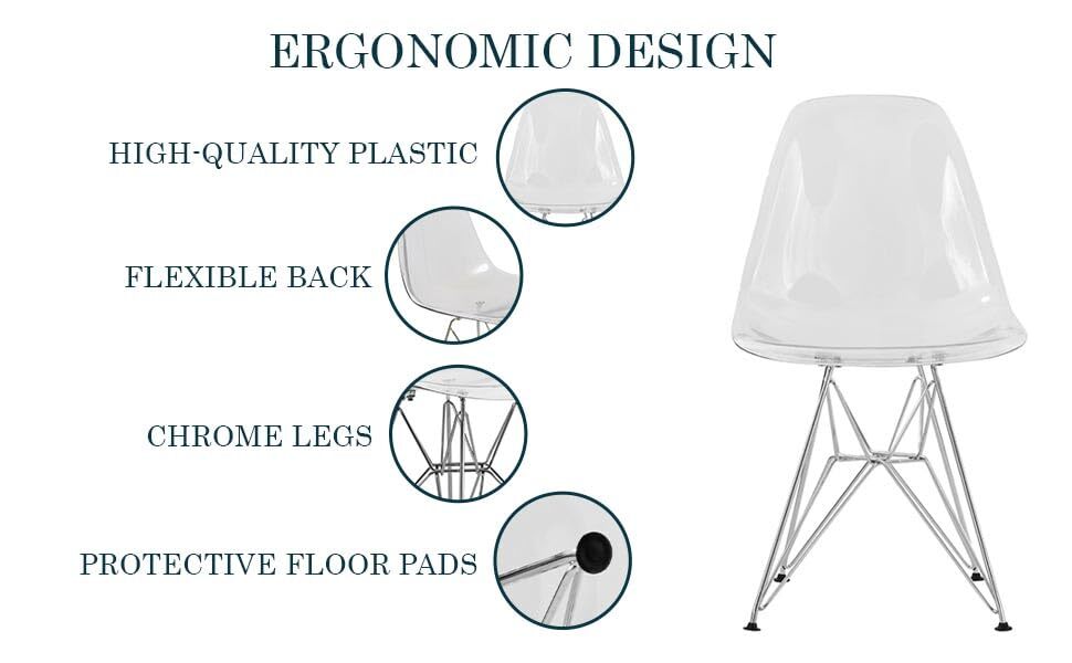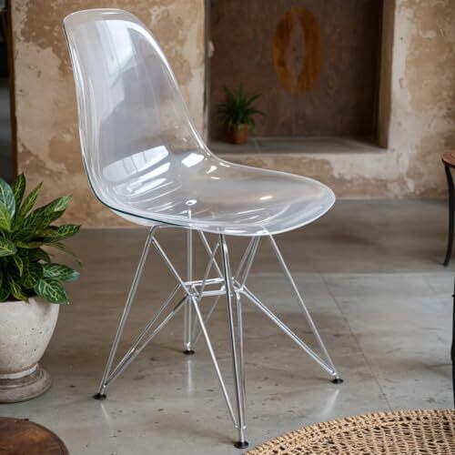 Experience the blend of style and function with the LeisureMod Cresco Dining Chair, crafted as a standout piece for versatile seating. This accent chair features a modern acrylic molded seat with a comfortable curved back, perfect as both a modern home chair and a commercial seating chair. Designed as a lightweight plastic dining chair, it?s easy to move and reposition, while the durable chrome Eiffel base with an X-shaped support offers exceptional stability. Protective rubber floor pads prevent scratches, making it safe for any surface. Whether you?re looking for a chic acrylic accent chair or a comfortable ergonomic chair, this modern acrylic chair delivers on all fronts. With easy assembly, this versatile seating option will elevate your space with timeless appeal and practicality. Choose LeisureMod for quality, design, and lasting comfort.