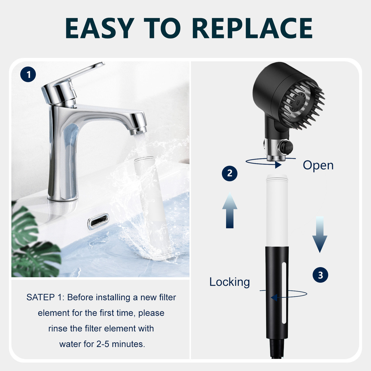 Replacing your filter takes less than 20 seconds no tools required, you just need to unscrew the shower head by hand, take out the old one and replace the new one,make sure the washer is in the slot which is inside the filter to avoid leaking.