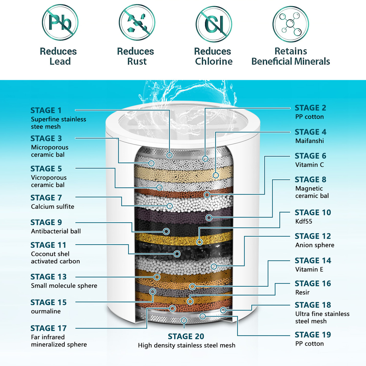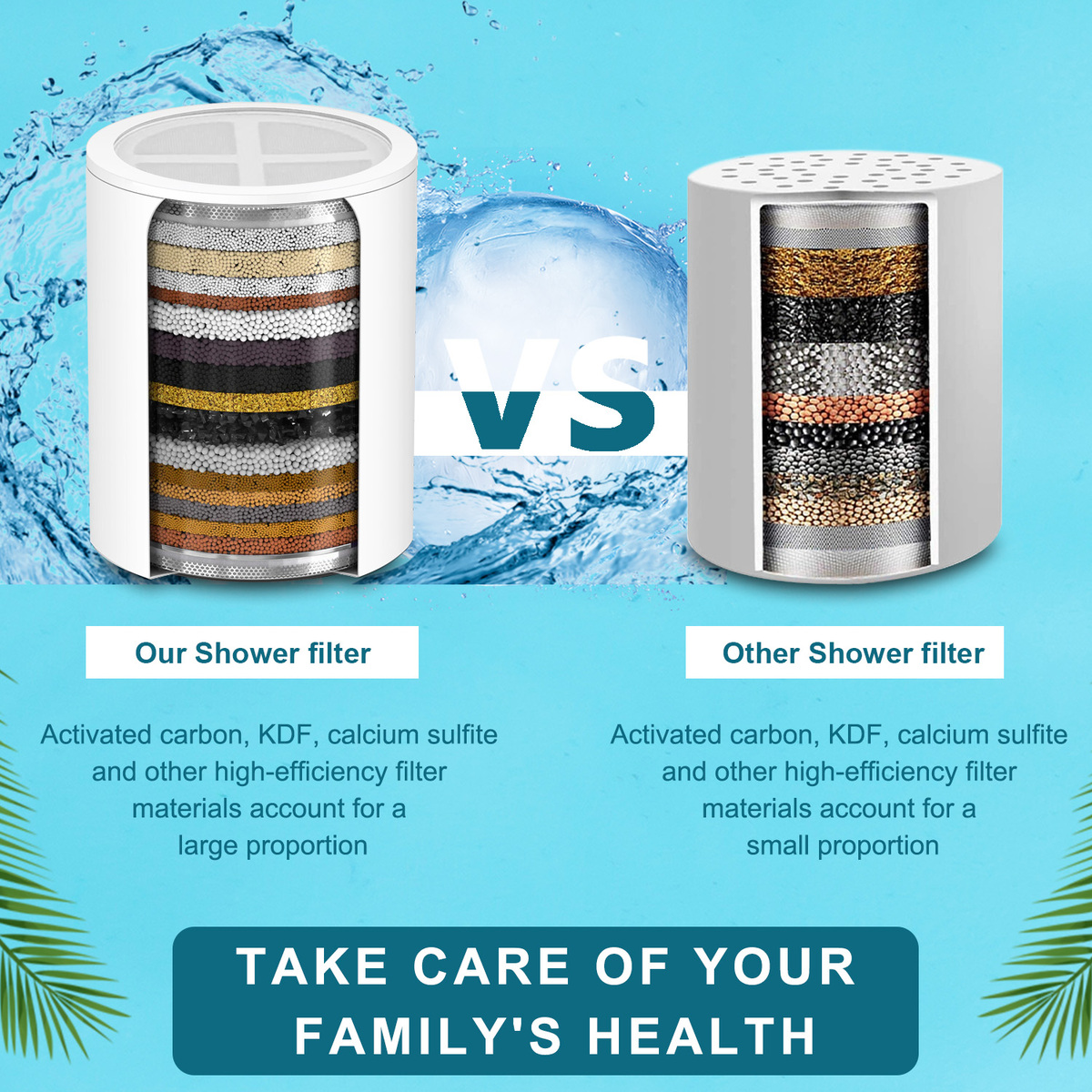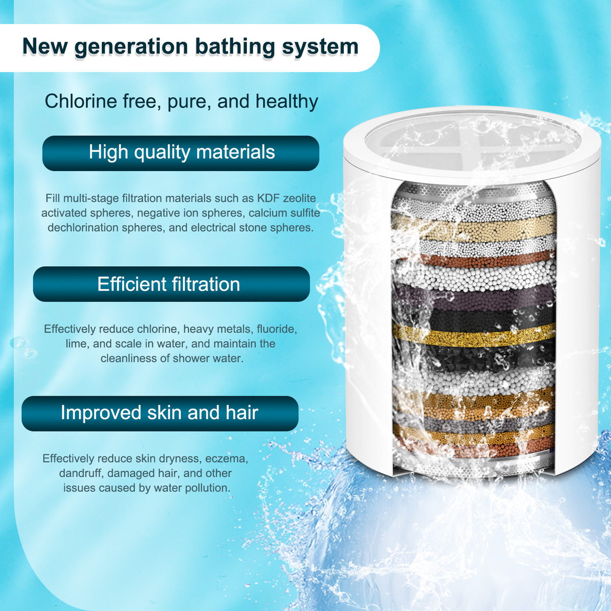 Our Multi-stages shower filter can effectively reduce chlorine, fluoride, heavy metals, rust, sand and other sediment. It effectively controls scale buildup and restores the damage caused by hard water and chemicals to your hair, skin, and nails.