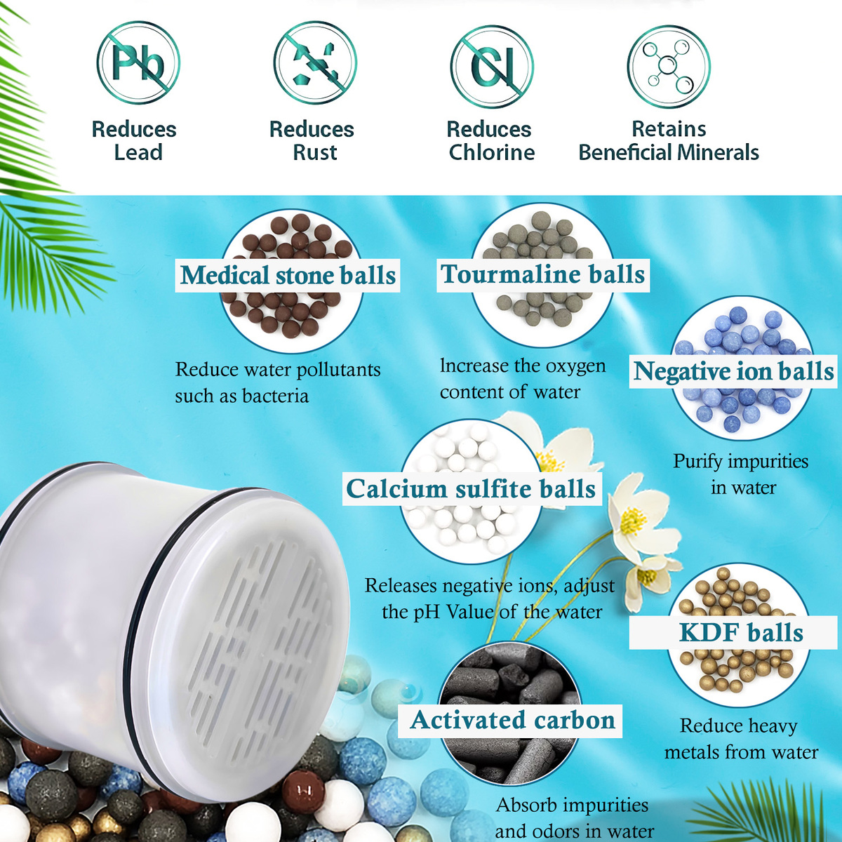 Our Multi-stages shower filter can effectively reduce chlorine, fluoride, heavy metals, rust, sand and other sediment. It effectively controls scale buildup and restores the damage caused by hard water and chemicals to your hair, skin, and nails.