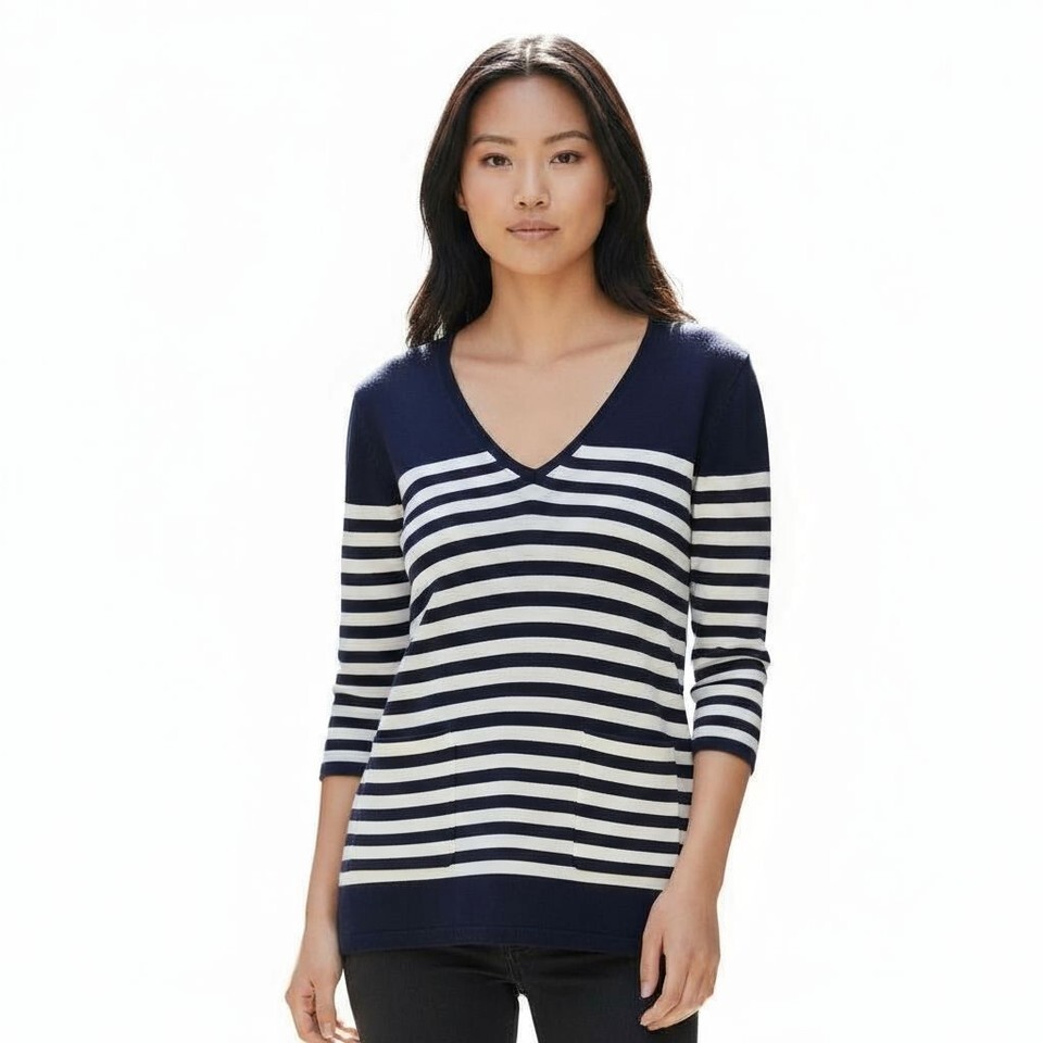 Lauren Ralph Lauren long-sleeve sweater in size Large. Featuring a classic navy and white horizontal stripe pattern with a solid navy yoke, this 100% cotton top offers timeless nautical style and all-day comfort. The anchor-engraved button detail adds a refined touch. Perfect for layering or wearing solo in spring and fall.