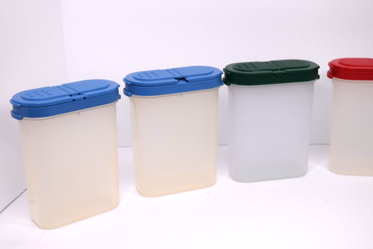 Set of 10 Tupperware Modular Mates Spice Shakers Containers. Pre-owned in good condition. Some signs of wear and use. No damage. There are 6 tall and 4 short shakers. Lids are different colors. See all photos for details and conditions. Will ship USPS Ground Advantage.