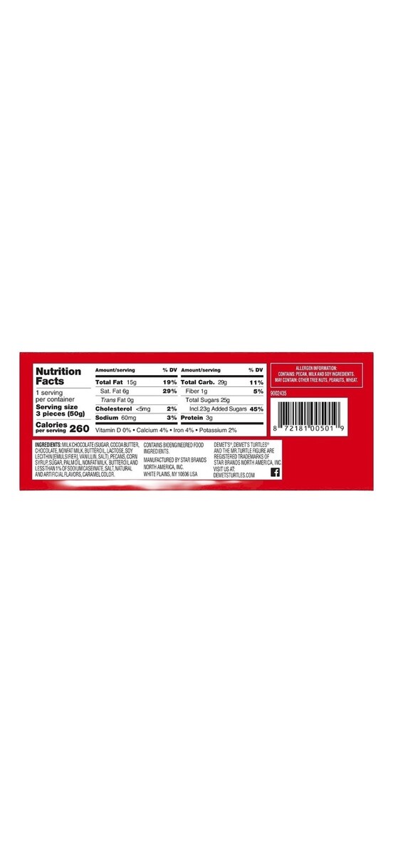 Demet's Turtles Chocolate covered pecans in caramel flavor are very delicious to taste. Chocolate covered pecans are stuffed in a 1.76 oz pack and are ideal for fun parties, sold as 24 packs per box.
