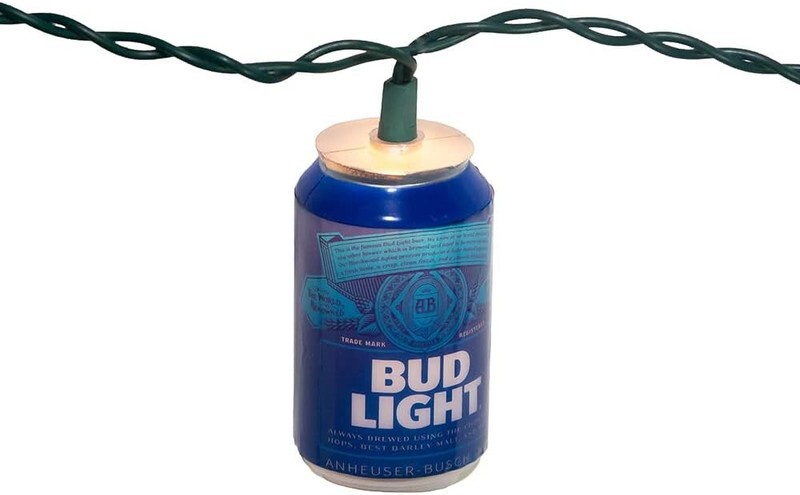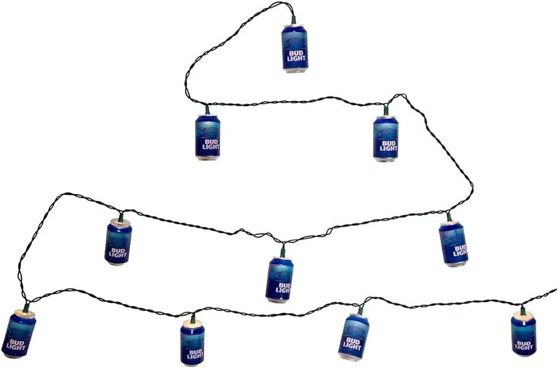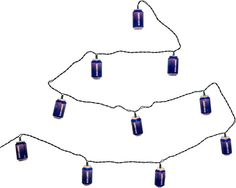 This 10-light Bud Light beer can light set by Kurt Adler is a fun way to add to the lighting of your holiday or party decor. Each of the 10 lights in this novelty light set resembles a can of Bud Light beer. Set features include 30" x 12" green lead wire, 12V 0.08A clear incandescent bulbs, 4 spare bulbs and 1 spare fuse. For both indoor and outdoor use.