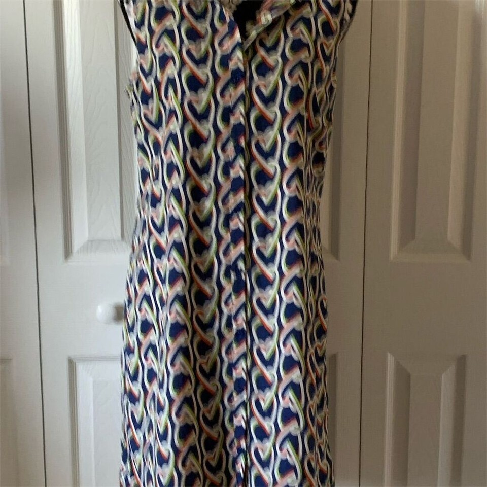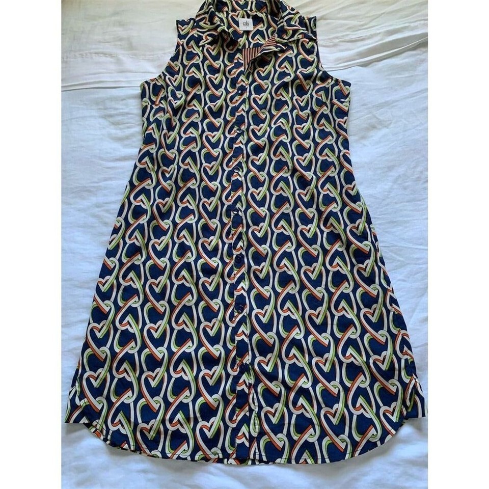 Keywords: CAbi, shirt dress, knee-length, multicolor, heart print, casual, spring, polyester blend, sleeveless, button-down, lined, women's fashion, pre-owned, China.