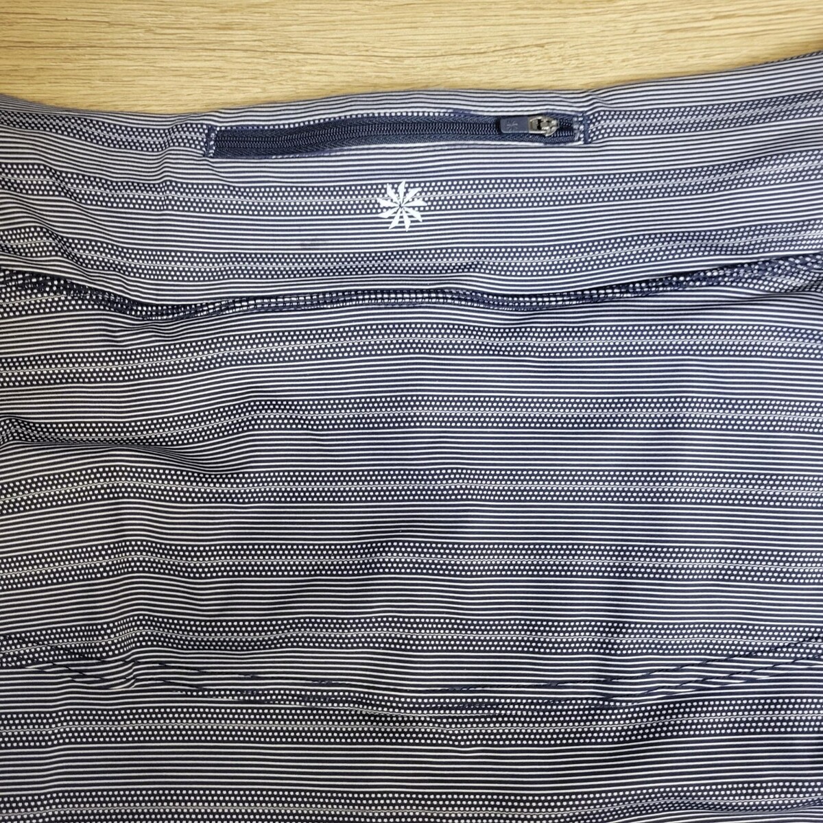 Navy striped pattern. Contains a back zipper for Keys or ID.