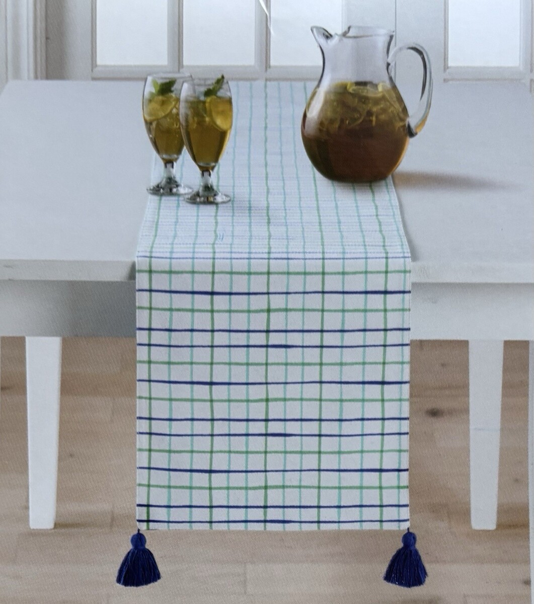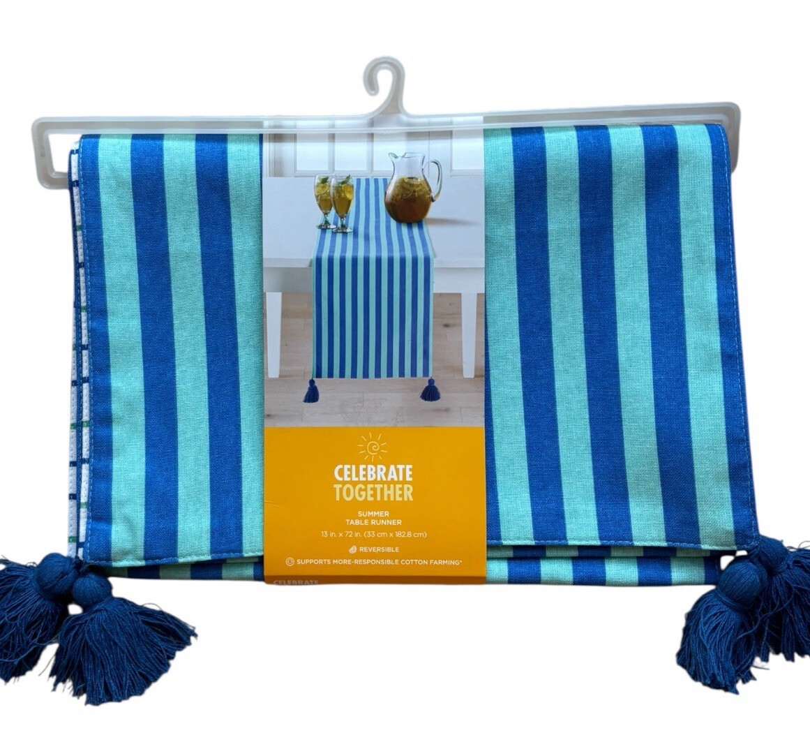 Celebrate Summer Together Blue Stripe Reversible Table Runner 13x72 100% Cotton Tassels Plaid Green White