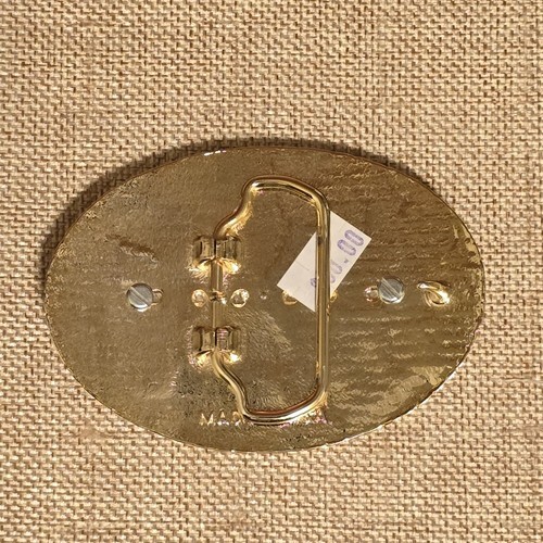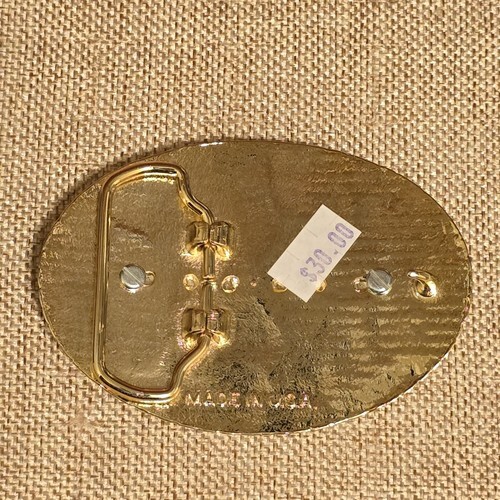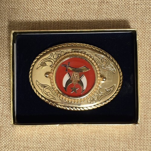 New in Original Box Vintage Shriners Logo Masonic Gold Tone Red Oval Belt Buckle - Made in USA.