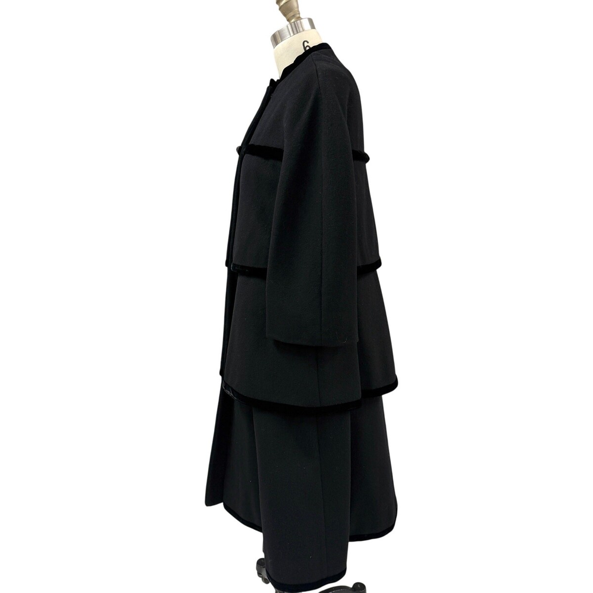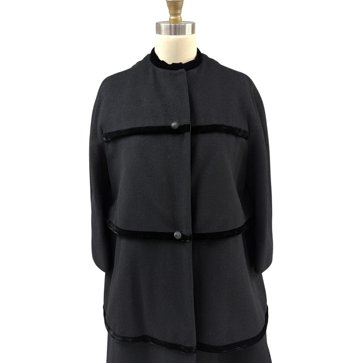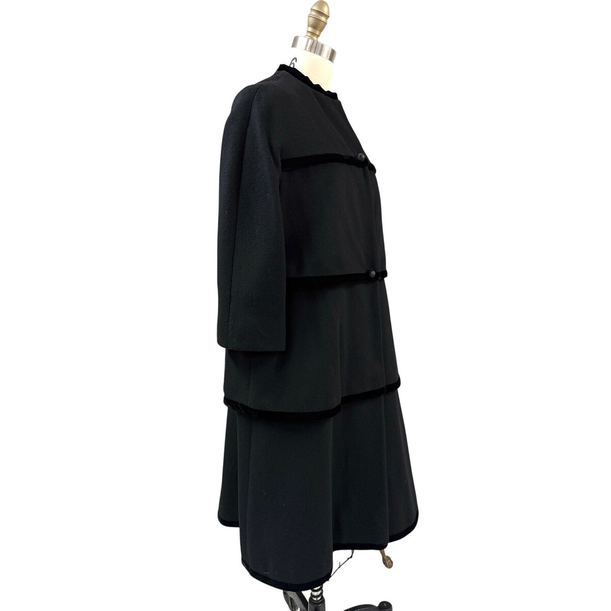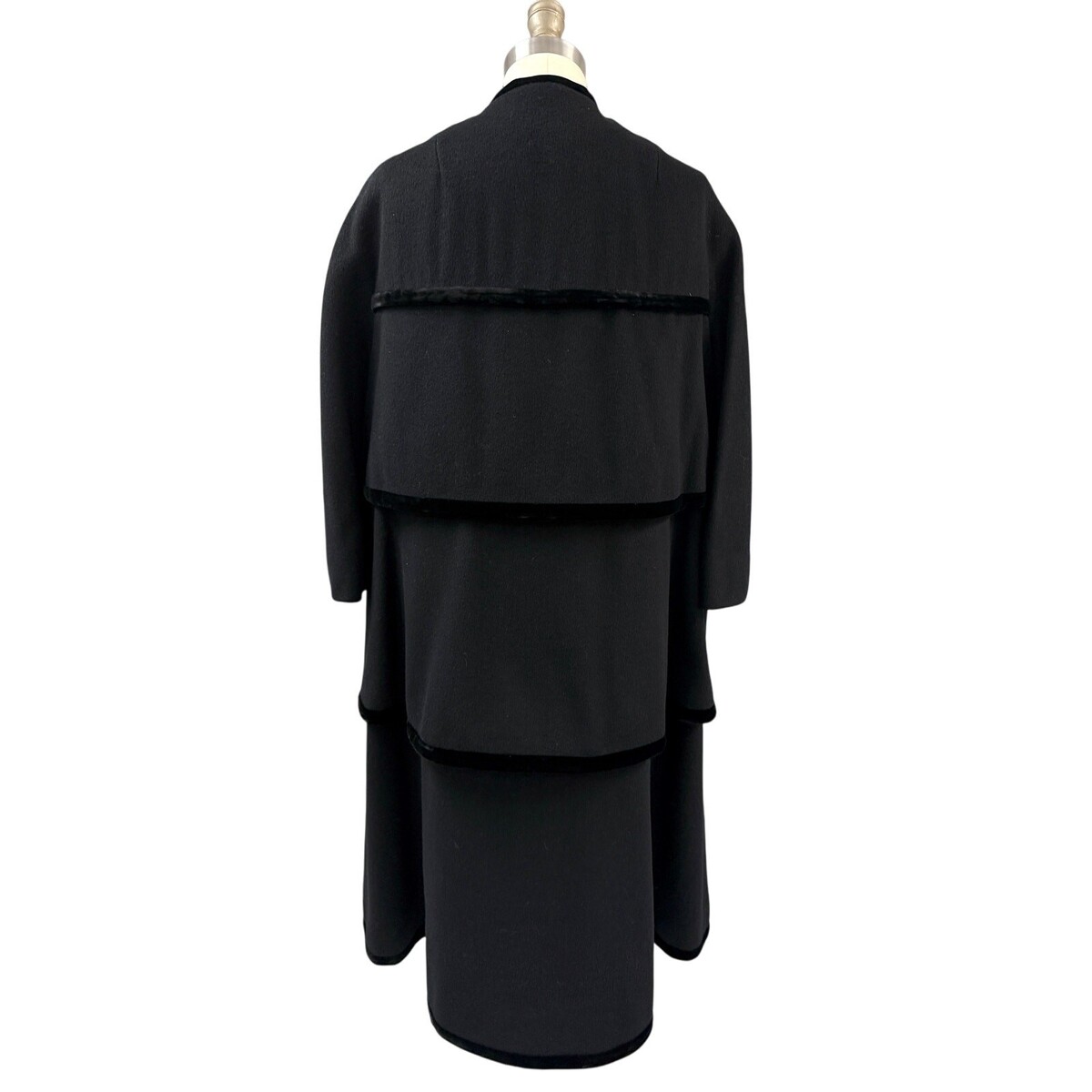 Vintage 1950s Lilli Ann Paris trapeze coat crafted from black wool with tiered panels edged in black silk velvet. Features concealed snap fasteners, two round textured buttons, and elegant one-piece sleeves with no shoulder or armhole seams. The interior is lined in satin. The trapeze silhouette is understated but still present, offering timeless mid-century elegance.