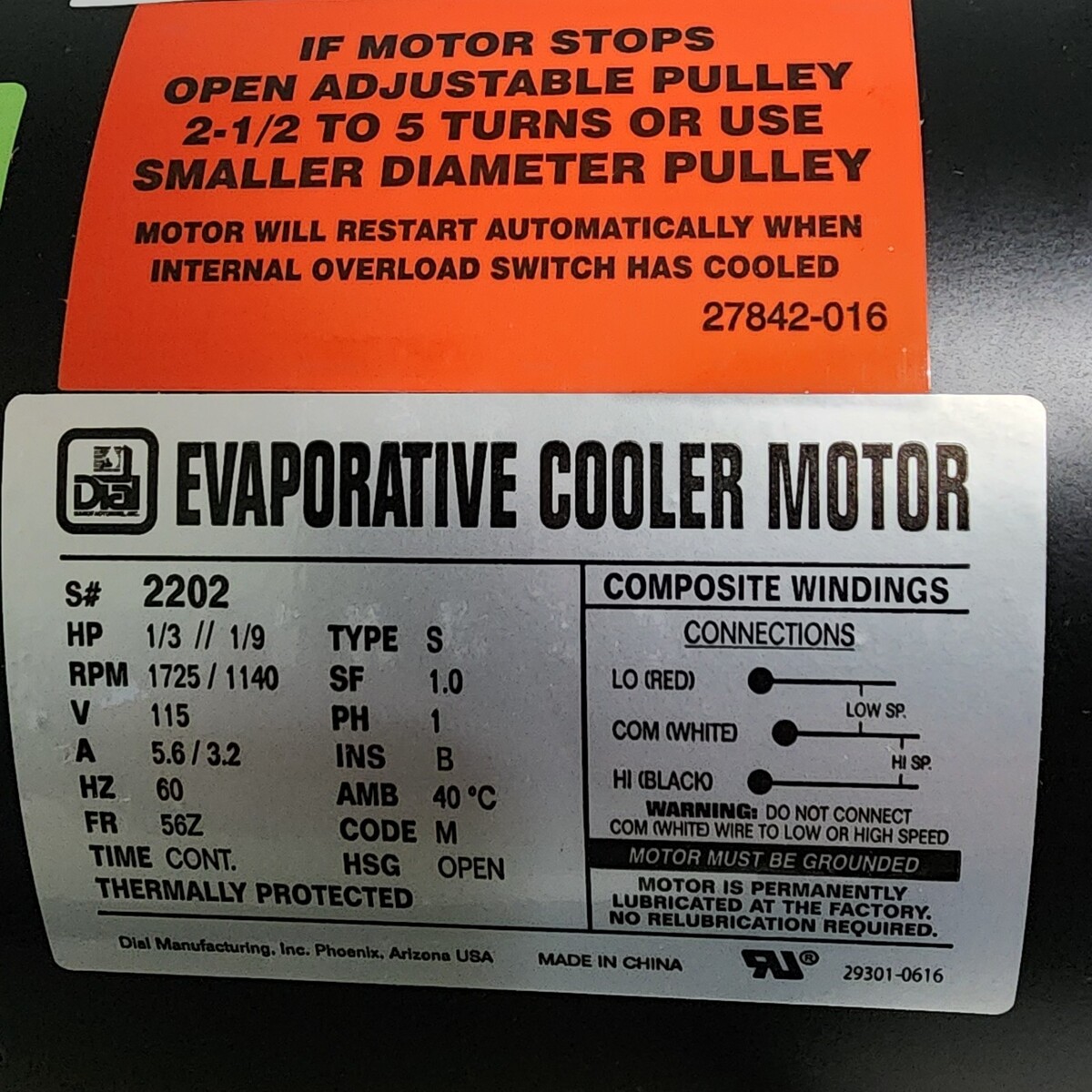 Dial Motor Kit 1/3 Hp 115 V 2 Speed 1725 RPM Model 2537. Shipped with USPS Ground Advantage.