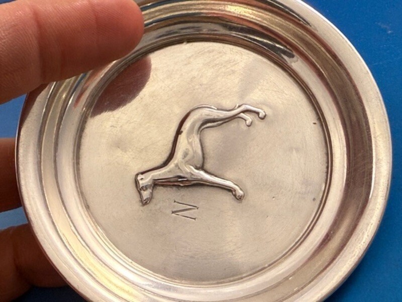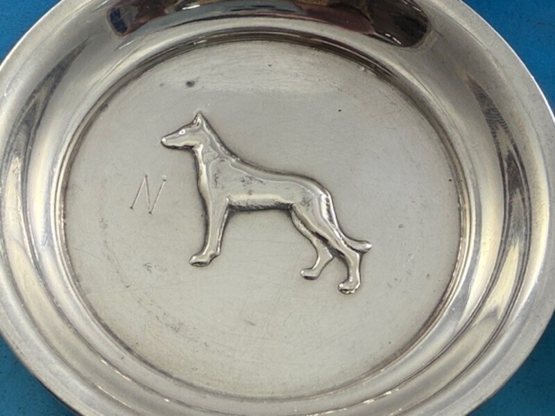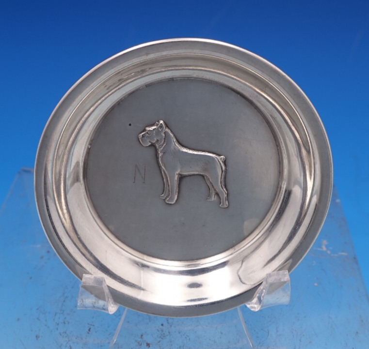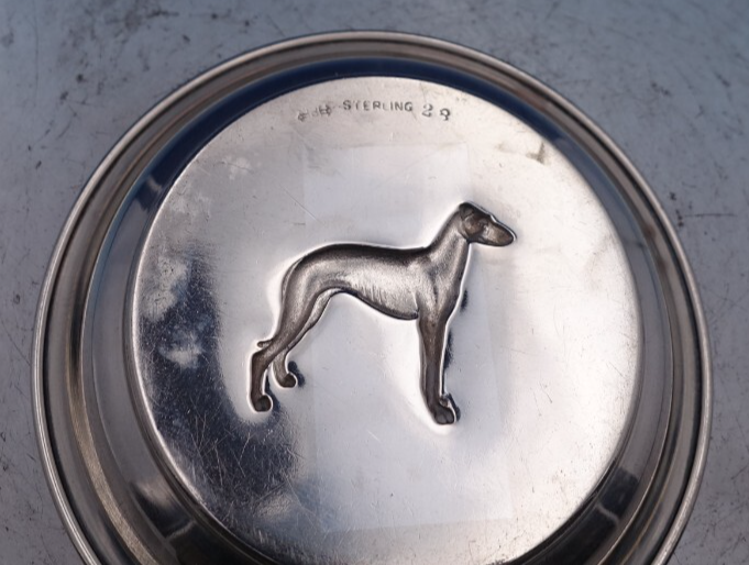 Exceptional sterling silver six piece nut cup set featuring various repoussed dogs in the center of the cup (maker unknown). There are two cups of each design - Schnauzer, Greyhound, and Whippet. The cups are individually marked #25, #27, and #28 depending on the pattern.