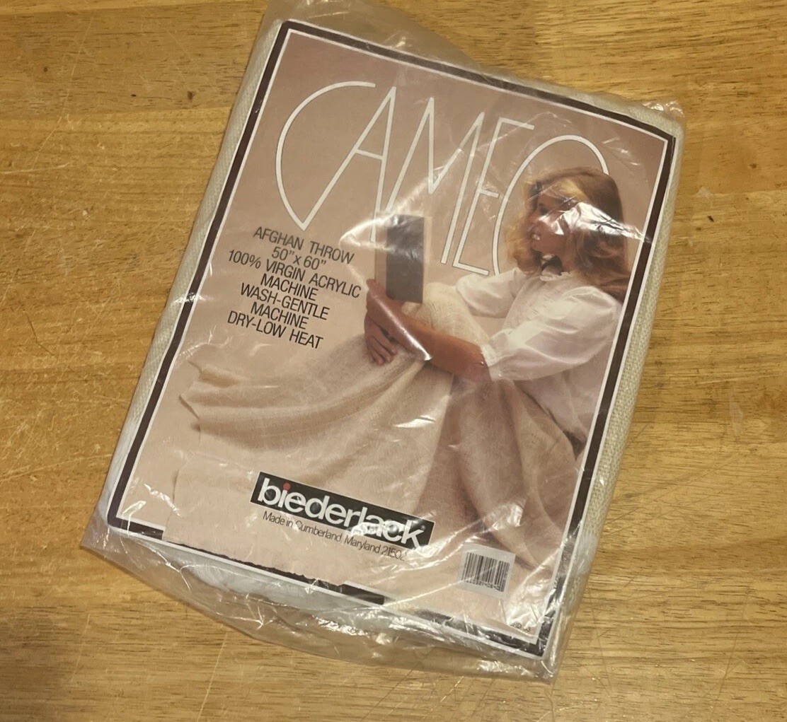 This vintage Biederlack acrylic throw blanket features a beige color with a geometric cameo fringe design, giving it a bohemian and romantic style. Measuring 50 x 60 inches, this rectangular blanket is perfect for adding a cozy and unique touch to any room. Made in the United States, this original piece is machine washable and breathable, making it a versatile and stylish addition to any home decor.