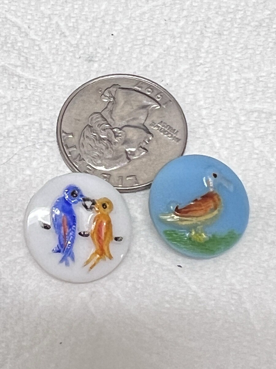 2 Vintage Milk Glass Buttons 1 w 2 Birds 1 w Yellow Duck Bird 5/8 inch In very nice shape