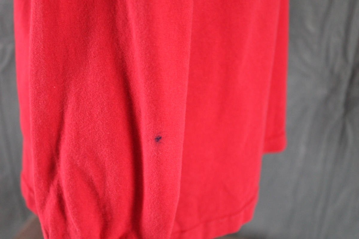 This shirt is in fair condition. There is staining on the sleeves of the shirt. Please see the images for your reference.