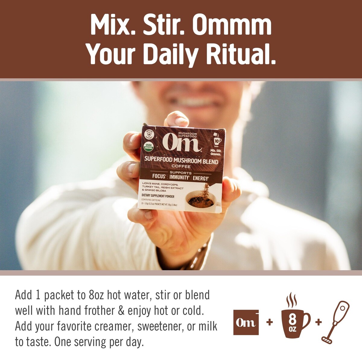 2 Boxes Expiration date of 9/2026 ? ENERGY, FOCUS AND IMMUNE HEALTH - This rich bold coffee blend combines organic Arabica beans with functional mushrooms including Lions Mane, Cordyceps, Reishi, and Turkey Tail to naturally support energy, focus, immune health, and daily performance. ? 2000MG FUNCTIONAL MUSHROOMS - Each serving delivers 2000mg of organic whole food mushroom powder with 400mg of beta glucans to naturally support immune health, build resilience, and fuel long term wellness. ? GREAT TASTING ARABICA COFFEE - Crafted with smooth 100 percent organic Arabica coffee for a bold full bodied flavor. Designed for coffee lovers who want the functional benefits of mushrooms without sacrificing the rich satisfying taste of premium coffee. ? CONVENIENT SINGLE SERVE PACKETS - Includes 10 travel friendly packets that mix easily with hot water or milk of choice. Ideal for at home, at work, or on the go, making wellness a simple and enjoyable ritual anytime. ? OM MUSHROOMS: We grow, dry, and mill our mushrooms in Southern California, ensuring every product is proudly USA grown the Om way. Our powders, capsules, beverage mixes, and gummies are USDA Certified Organic, Non GMO, gluten free, vegan, paleo friendly, keto friendly, and kosher. Each batch is third party tested for purity and potency. Explore our line designed to support daily health, focus, clarity, energy, immune defense, and restful sleep.