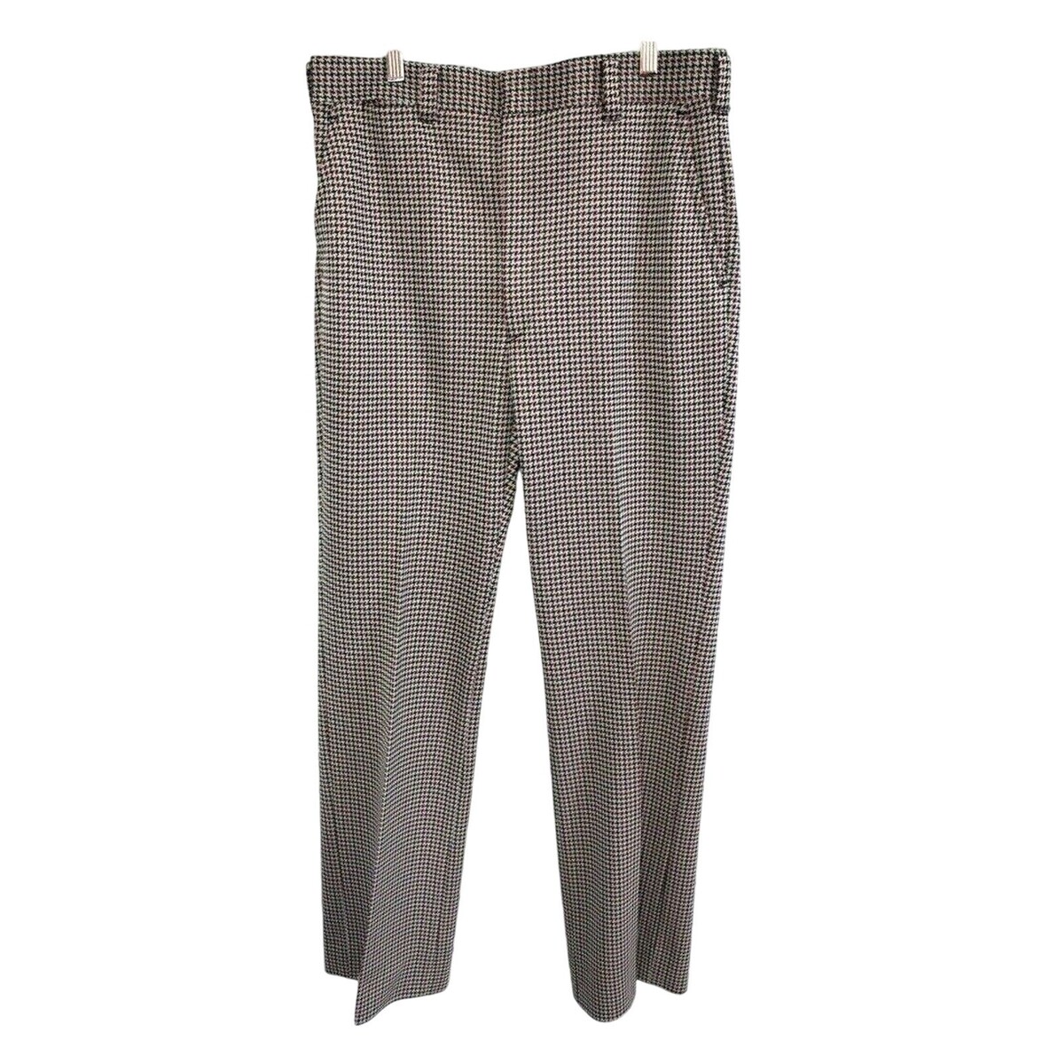 Authentic 1970s men?s leisure pants, waist 35 x inseam 33.5, in a rust, green, and beige houndstooth pattern. Classic disco-era styling with a polyester blend body, straight fit through the thigh, and slight flare at the hem. Perfect for pulling off that 70s lounge or dance-floor look.