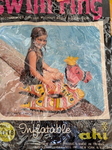 This vintage 1970 Seahorse Swim Ring Inflatable Boat Pool Toy Floatie is a must-have for any water SPORTS enthusiast. With its vibrant blue, yellow, and pink colors, it's sure to catch the eye of anyone in the pool or on the beach. Measuring 21 x 18 inches, it's the perfect size for swimming around in or taking on adventures in the water. Made by Ahi Azrak-Hamway and manufactured in Taiwan, this unit is of high quality and sure to last for many summers to come. The seahorse design is charming and adds a touch of whimsy to any water outing. Don't miss out on the opportunity to add this unique and fun inflatable to your collection.