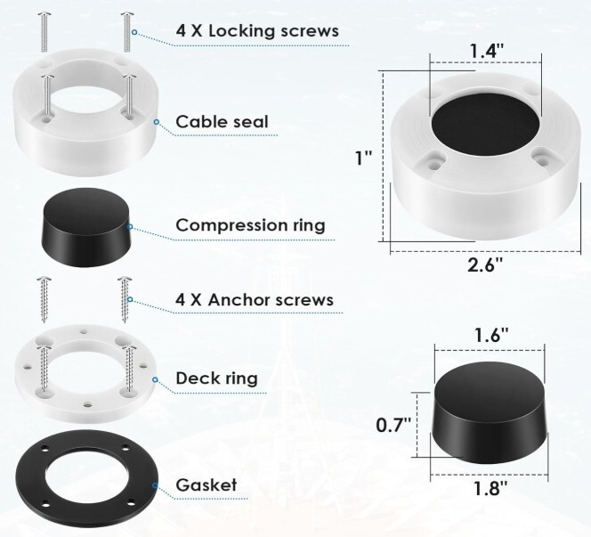 Description of item: This round waterproof cable gland provides a secure and watertight seal for cable pass-throughs on boats, vehicles, and home installations. Designed for durability, it includes a cable seal, compression ring, deck ring, gasket, and mounting screws. Ideal for marine wiring, solar panel systems, and outdoor electrical setups. Easy to install and built to protect against water, dust, and corrosion. Brand new and ready for use.