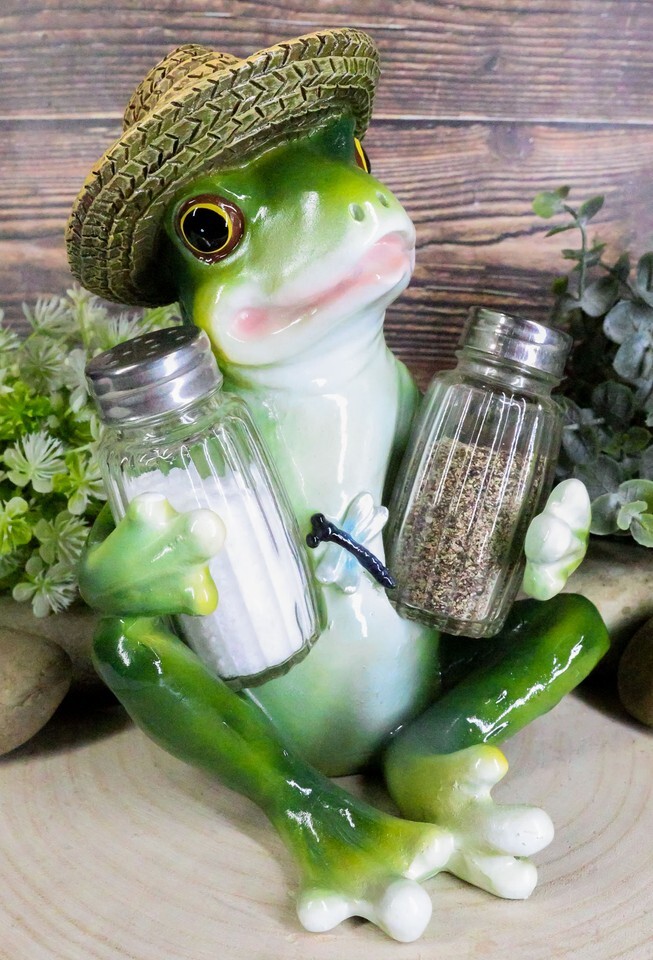 ? This "Croak" Tree Frog And His Buddy Dragonfly Salt Pepper Shakers Holder Figurine is made of polyresin, hand painted and polished individually. Color Tone may vary from pictures. This listing comes with two glass shakers as pictured without the condiments.