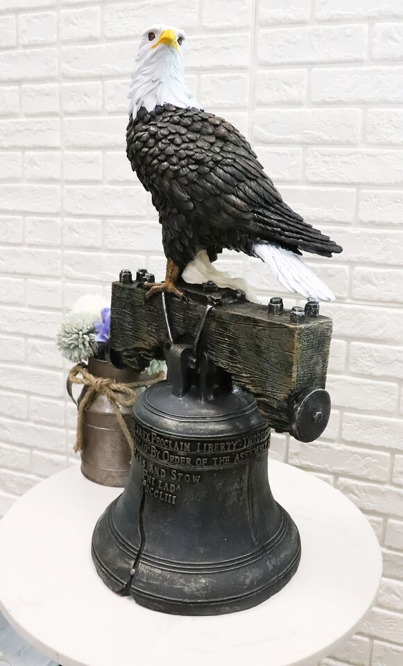 ? This stunning patriotic statue, titled `Let Freedom Ring`, features a majestic eagle perched atop a replica of the Liberty Bell. On the surface of the bell, at the top line are the words "Proclaim liberty throughout all the land unto all inhabitants thereof." The next two lines are also engraved with the words found in the actual Liberty Bell itself.