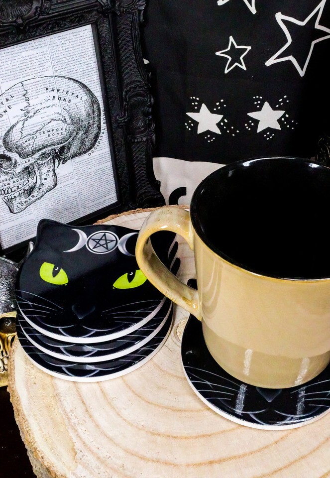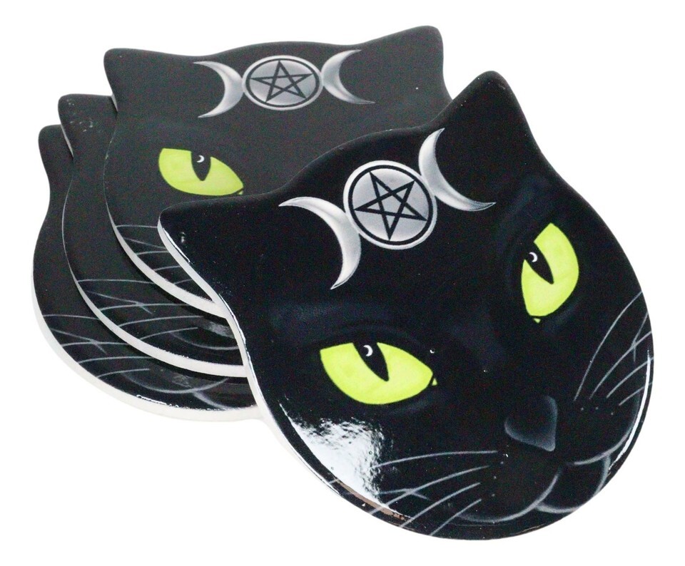 Ebros Wicca Black Cat Face Triple Moon Goddess Cork Backed Ceramic Coasters 4pcs