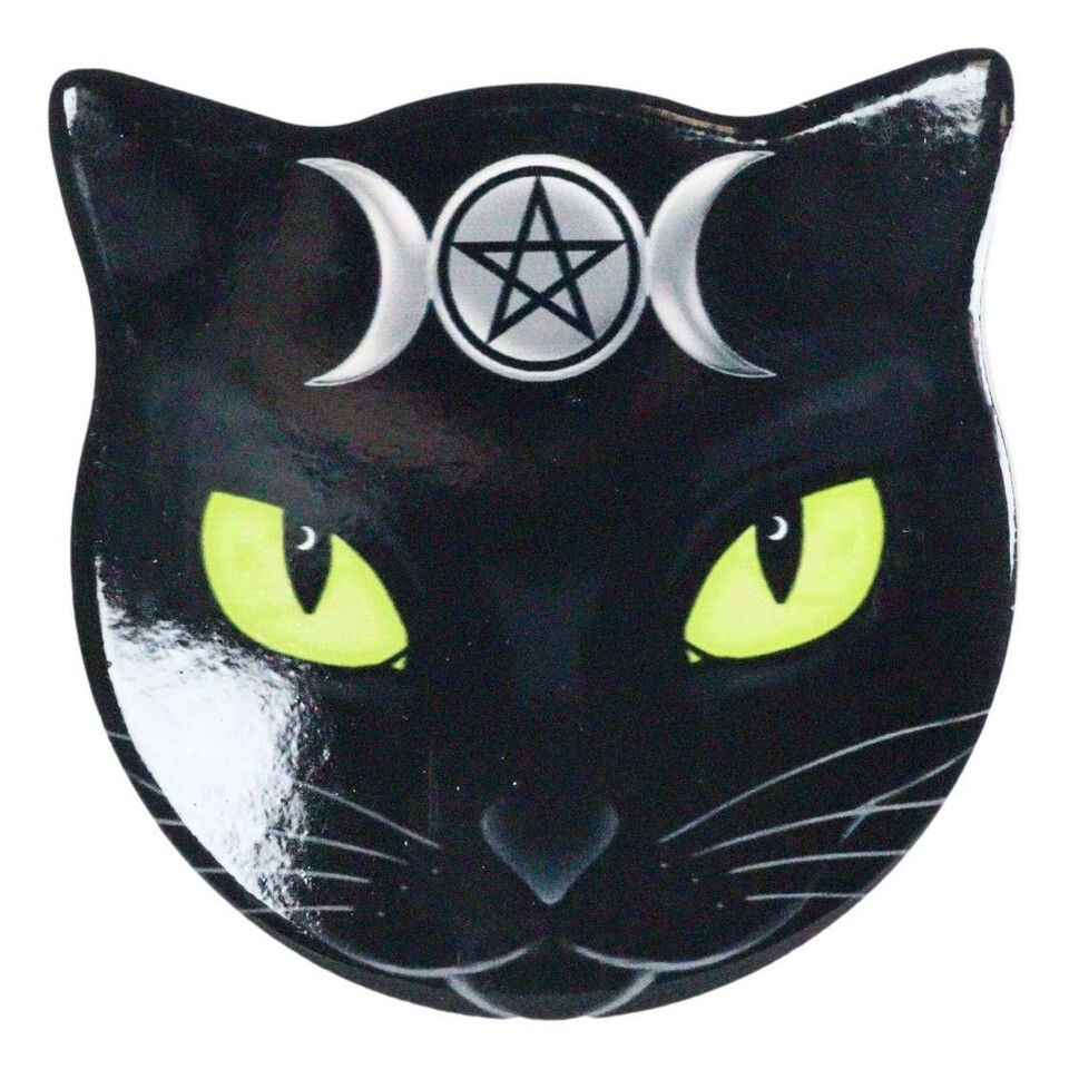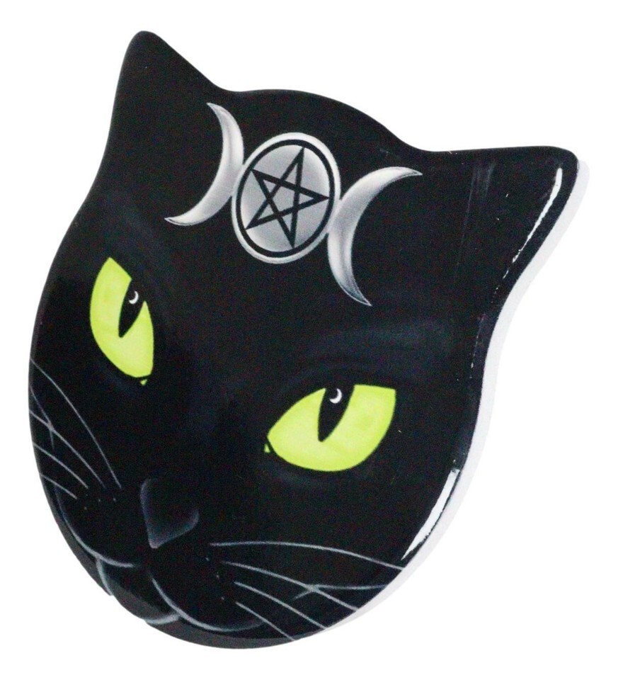 ? Dark but cute, this triple moon, magic cat coaster is definitely that! Shaped as the face of a feline cat, the high gloss finish of the coaster brings plenty of magick to your decore. Its a perfect addition to you home as a functional coaster for drinks, vases or just a fun decorative piece that will make a beautiful statement in your home!
