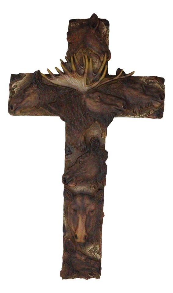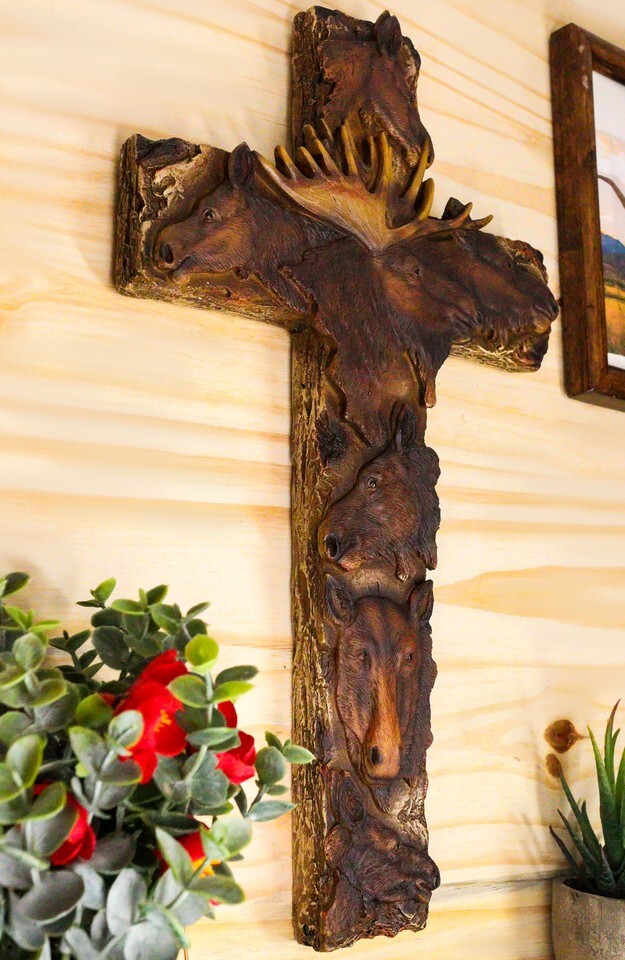 ? Western decor is all about spunk and spirit, bringing together the desert beauty of the southwest with rugged nature's charm and rustic good looks. In this wall cross we combine the rustic woodland elements with strong Christian gospel message. Stag Moose heads are aligned adjacent to one another, forming the vertical and horizontal planes of the cross. The cross is textured and hand painted in faux wood look, giving it warmth and cozy cabin lodge ambiance to your room.